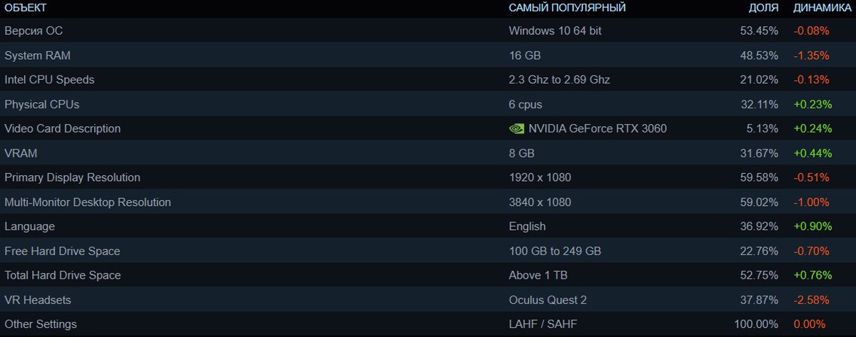 Усредненный ПК пользователя Steam сейчас выглядит так: 16 гигабайт памяти, 6-ядерный процессор Intel с частотой 2.3-2.69 ГГц, видеокарта GeForce RTX 3060.