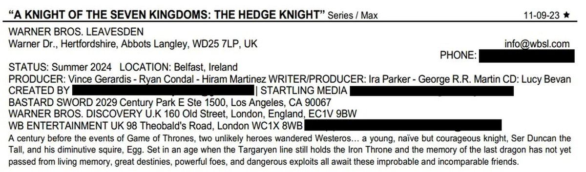 Начало работы над шоу, отмучает Redanian Intelligence, немного отложили. Прежде сериал по «Повести о Дунке и Эгге» планировалось начать снимать весной 2024 года; скорее всего, задержка связана с забастовками Гильдии сценаристов и Гильдии актеров США.