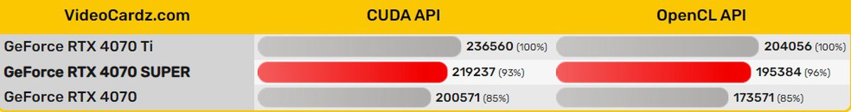 В первом тесте GeForce RTX 4070 Super набрала 219237 баллов, во втором — 195384 балла. Согласно подсчетам VideoCardz, в этих тестах GeForce RTX 4070 Super лишь немногим медленнее обычной GeForce RTX 4070 Ti.