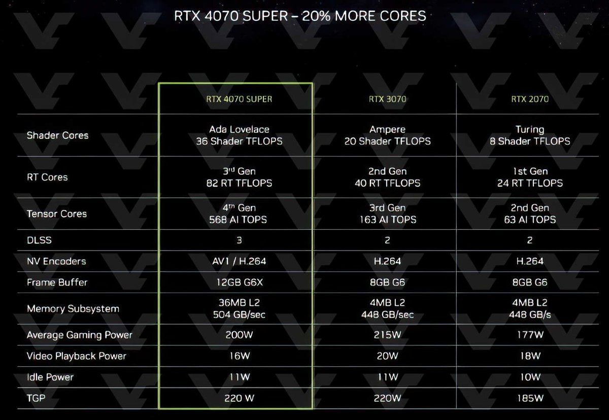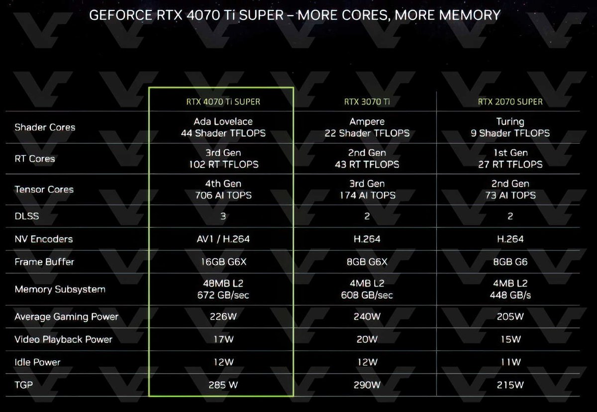 8 января Nvidia анонсирует видеокарты GeForce RTX 40 Super: на выставке CES компания покажет GeForce RTX 4070 Super, RTX 4070 Ti Super и RTX 4080 Super. Перед анонсом редакция VideoCardz опубликовала характеристики всех устройств.