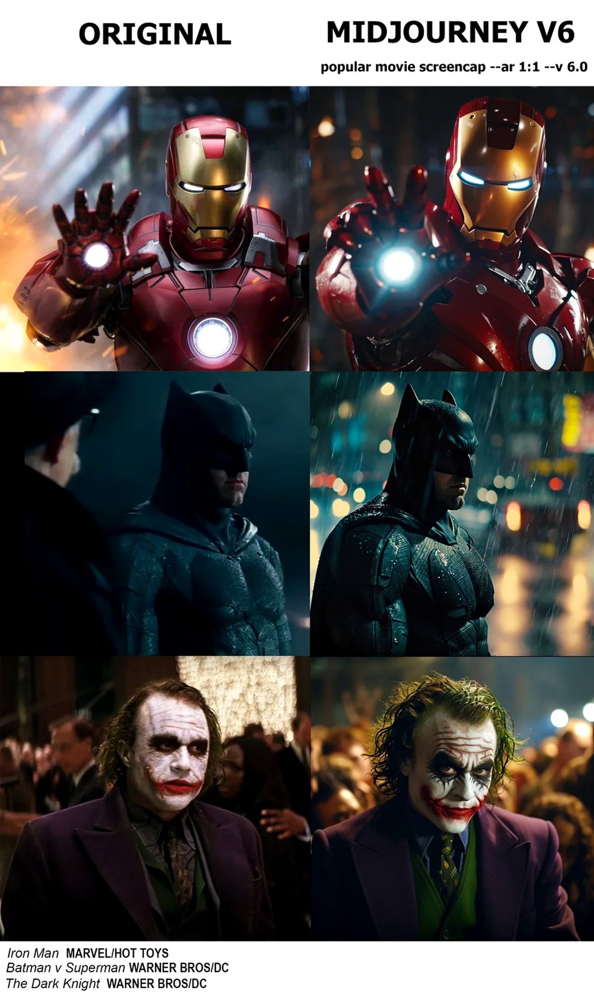 В рамках своего исследования Маркус и Саутен протестировали нейросеть Midjourney V6 на запросах, косвенно связанных с множеством популярных проектов. Оказалось, нейросеть может имитировать кадры из фильмов или персонажей даже без указания конкретных проектов.
