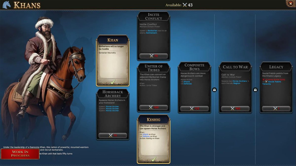 Первым идеалом можно брать 3 отряда конных лучников или сделать варваров на карте нейтральными по отношению к державе. Далее можно будет даже создавать лагеря варваров у врага под боком. Или улучшить хана до Чингисхана либо дать способность превращать варварские поселения в конных лучников. Потом получить по два отряда конных стрелков в каждом дружественном регионе. Выглядит весело. Кажется, получить 10 конных лучников для наследия проще простого.