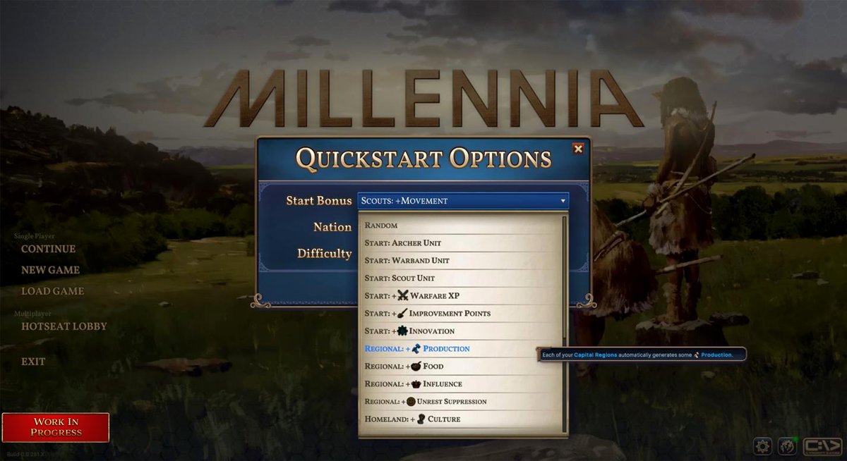 Для начала стоит посмотреть на интерфейс быстрого старта партии. К релизу он, конечно, может измениться, но пока мы видим, что игрок выбирает стартовый бонус, нацию и сложность.
