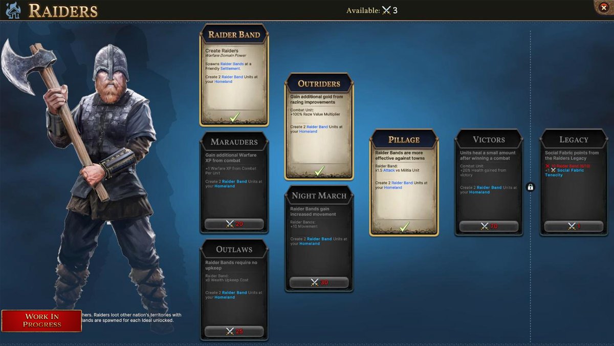 Далее переходим к идеалам, которые в ветке выбранного духа есть. Какой-то бонус сразу есть. На скриншоте ниже выбран нац. дух "Налётчики". Общий бонус - каждый получаемый идеал позволит лучше грабить и что-то там спавнится. Была бы плашка Work in Progress в другом месте, полностью бы прочитали.