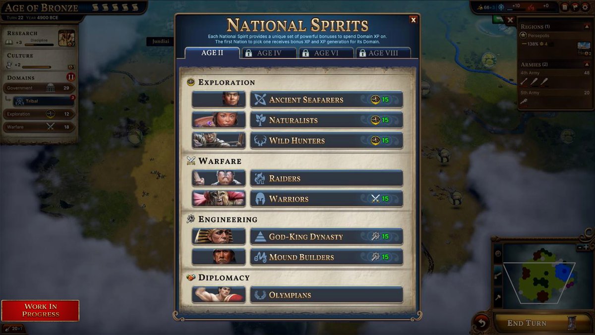 Во 2-ой, 4-ой, 6-ой и 8-ой эпохах откроется выбор одного нац. духа. Духи связаны с доменами, при этом на скриншоте в военное сфере 3 духа, в дипломатической 1. На взятие нац. духа требуется определённое кол-во опыта, хотя эти очки не платятся при открытии.