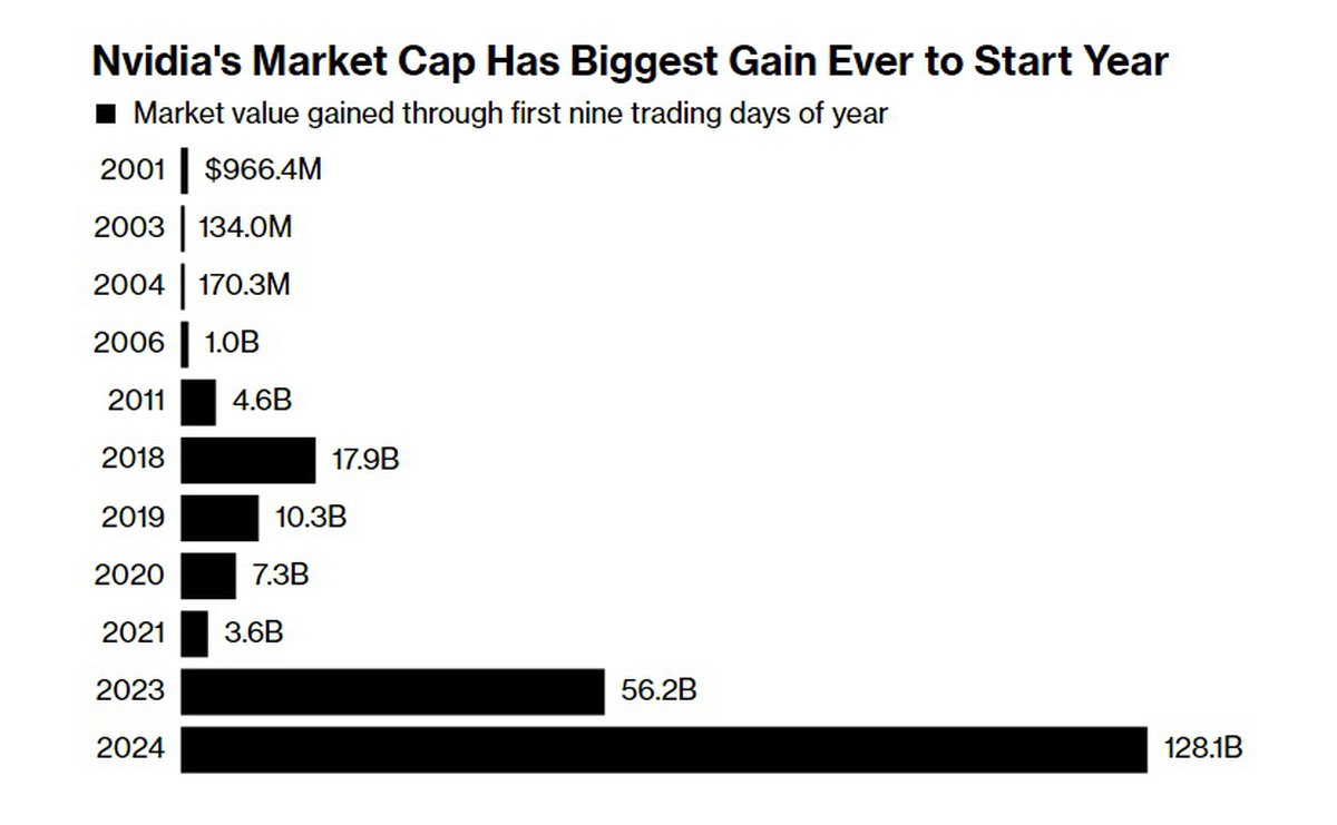 За первые две недели 2024 года капитализация Nvidia выросла примерно на 10% или на $128 миллиардов, подсчитали в Bloomberg. Это самое удачное начало года за всю историю компании.