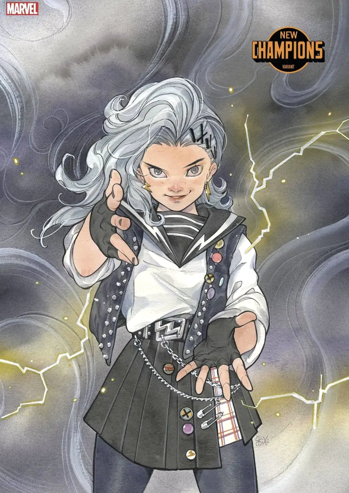 Пич Момоко: Источником вдохновения для Мейсторм послужила серия вариантных обложек New Champions, в рамках которой мне предлагалось создать японскую школьницу, боготворящую Ороро. Поэтому я хотела убедиться, что сохранила ключевые визуальные элементы школьной формы японских школьниц… и соединила её с культовой Грозой (особенно на неё повлиял её панк дизайн). Я чувствовала, что эта комбинация сделала слияние свежим, забавным, молодым и очень естественным.