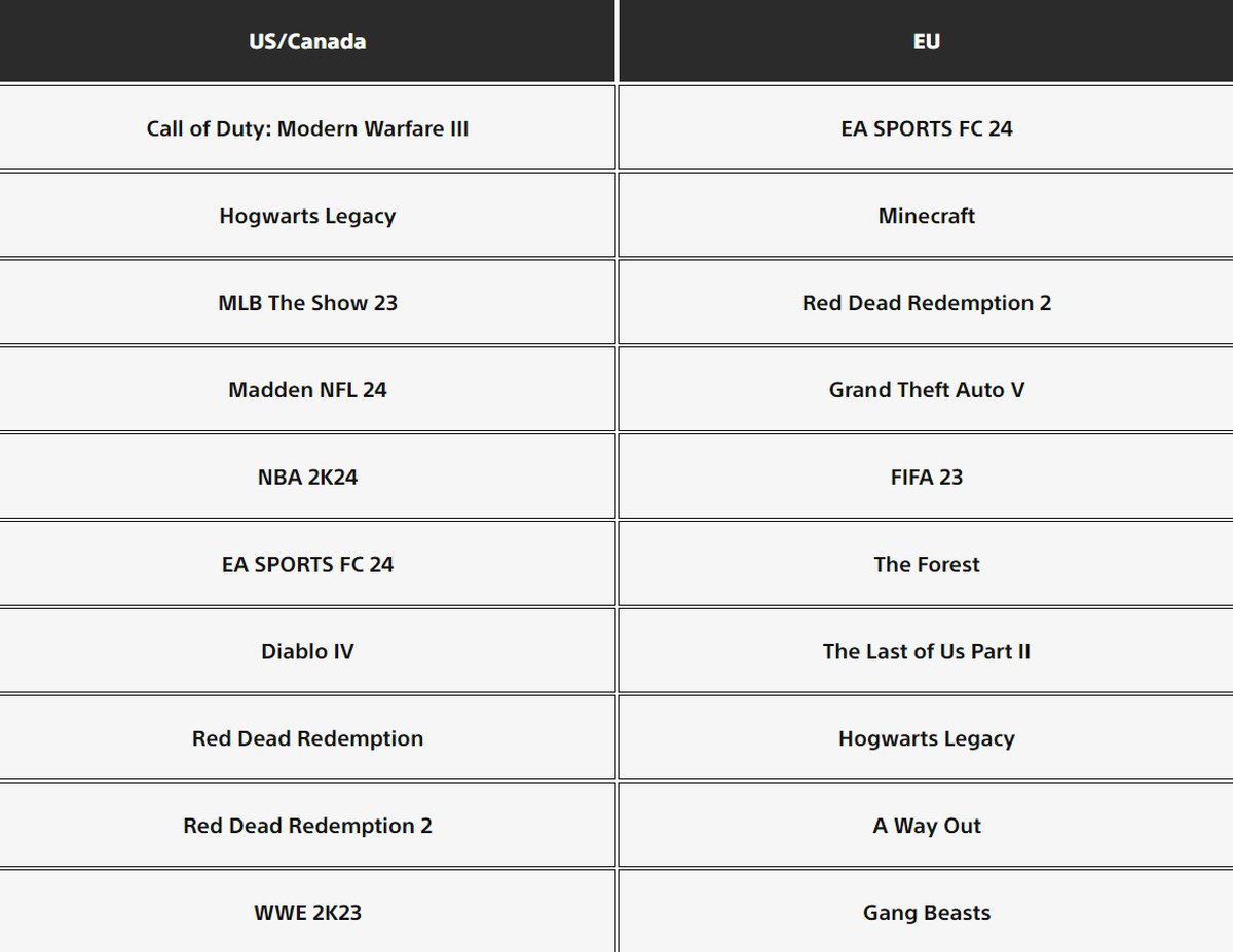 Игровое подразделение Sony опубликовало списки самых скачиваемых игр для PlayStation за 2023 год. Топы разделены по платформам и регионам: Европа и США/Канада, PlayStation 5 и PlayStation 4.