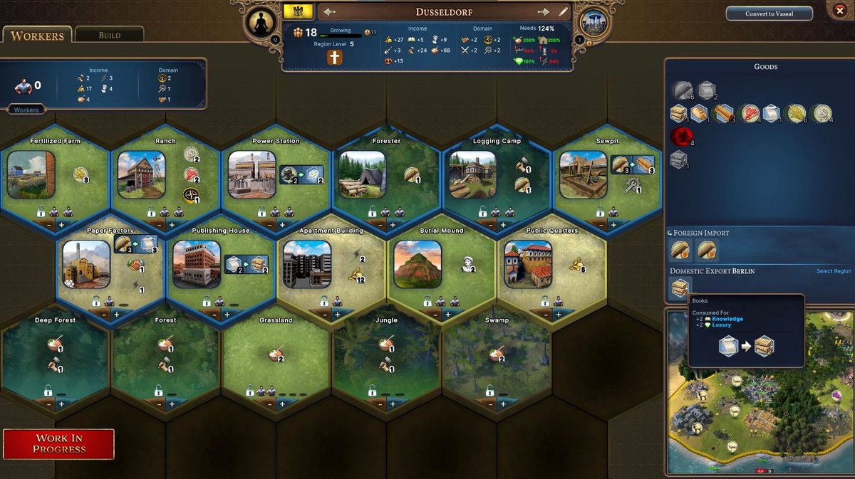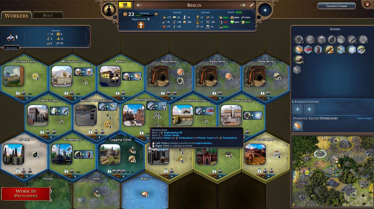 Из прошлого дневника мы помним, что на клетках региона можно расставлять население, чтобы качать оттуда разные абстрактные ресурсы или товарные ресурсы в зависимости от того, что это за территория. Клеточки можно улучшать, например, засеять поле, построить пекарню, завод. И даже цепочки есть, глина->кирпич, пшеница->мука, брёвна->доски, нефть->бензин и т.п.