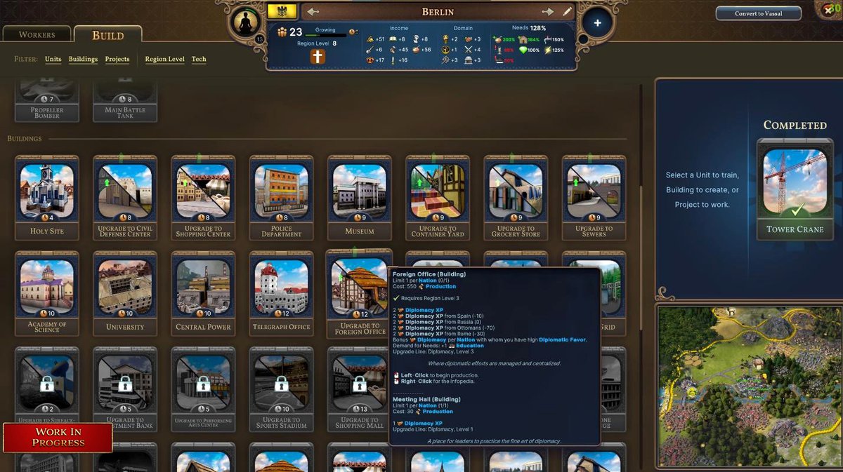 Рассказали про другое ограничение. В одном регионе нельзя построить 12 национальных достопримечательностей. Только, что эти достопримечательности дают в плане механик, не пояснили. Впрочем, на скриншоте мы видим лимиты и других штук, например, офис иностранных дел у нации может быть только 1 на всю страну.