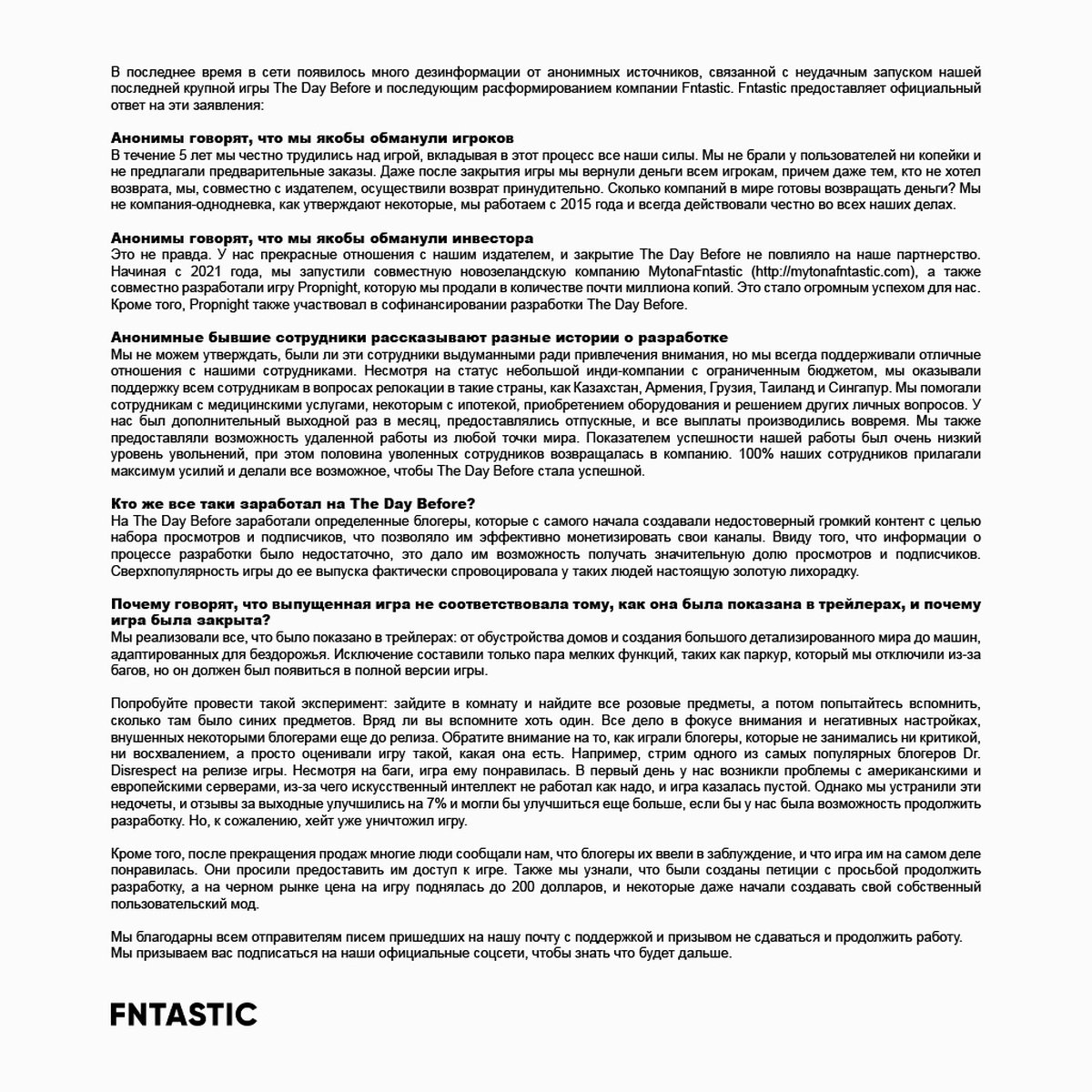 В заявлении студии опровергаются рассказы сотрудников о своеобразном подходе к работе, но не комментируется увольнение всей команды разработки одним днем. Кроме того, в Fntastic утверждают, что реализовали в The Day Before все, что планировалось.