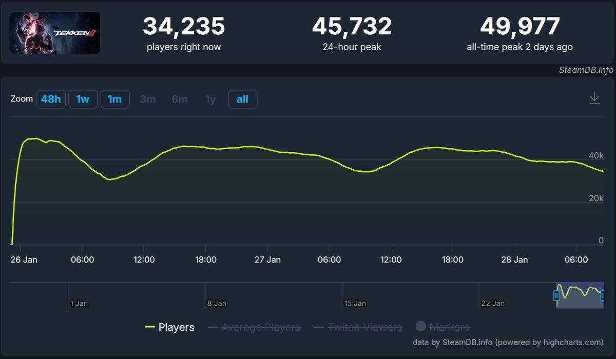 Tekken 8 показал лучший старт среди игр серии в Steam. Пиковый онлайн в игре сразу после релиза достиг 49977 человек, это лучший результат в истории франшизы.