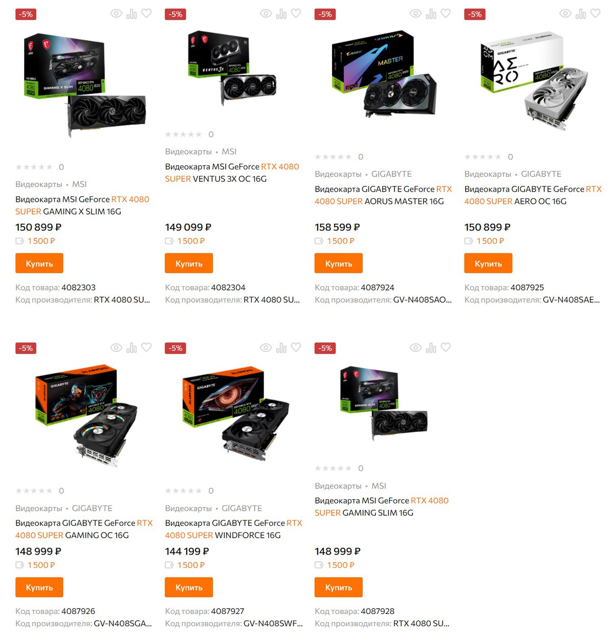 На Onlinetrade самая дешевая видеокарта стоит 144199 рублей (это версия от Gigabyte). Самая дорогая GeForce RTX 4080 Super продается за 158599 рублей (это тоже версия от Gigabyte). DNS пока не запустил продажи карты.