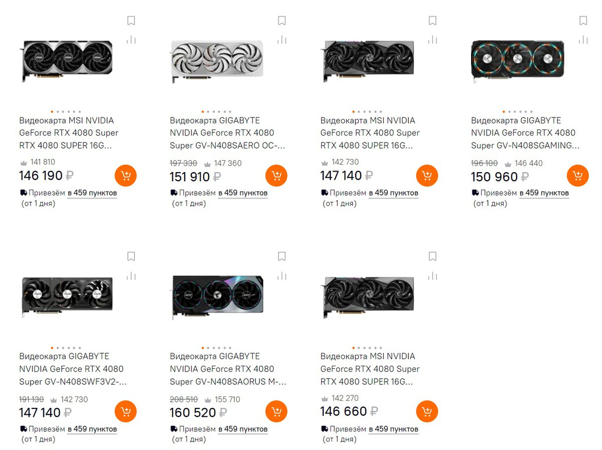 Сейчас GeForce RTX 4080 Super можно отыскать в российских онлайн-магазинах за 144-160 тысяч рублей. Например, в «Ситилинке» самая дешевая GeForce RTX 4080 Super стоит 146190 рублей (от MSI), самая дорогая обойдется в 160520 рублей (от Gigabyte).