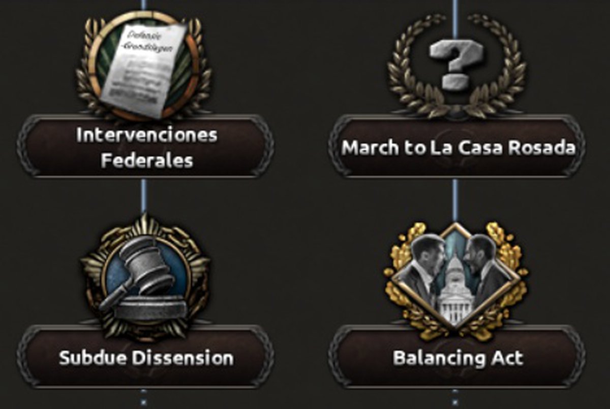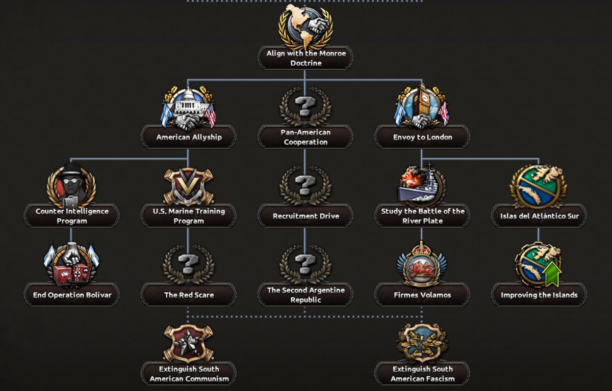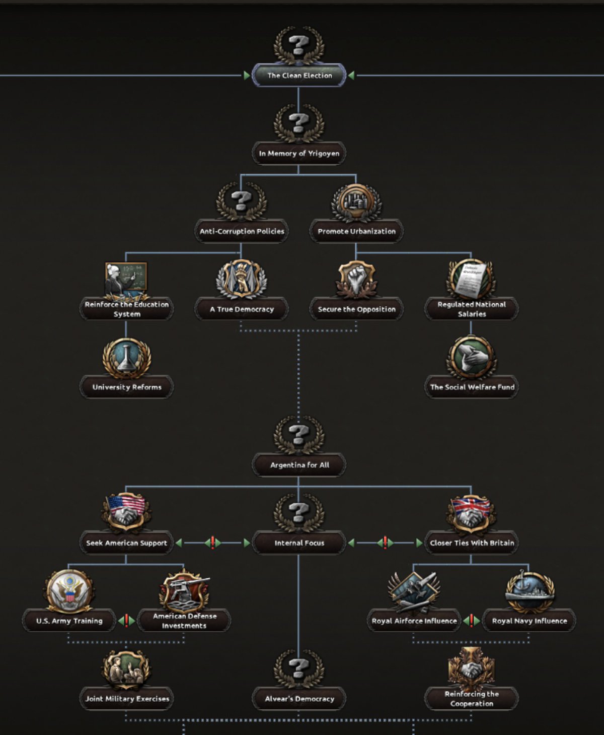 Затем игроку-демократу стоит обратить внимание на развитие армии, укрепив связи с США или Великобританией. Также есть третья ветка, в которой Аргентина сосредотачивается на внутренней политике и пытается стать новым бастионом демократии в Америках.