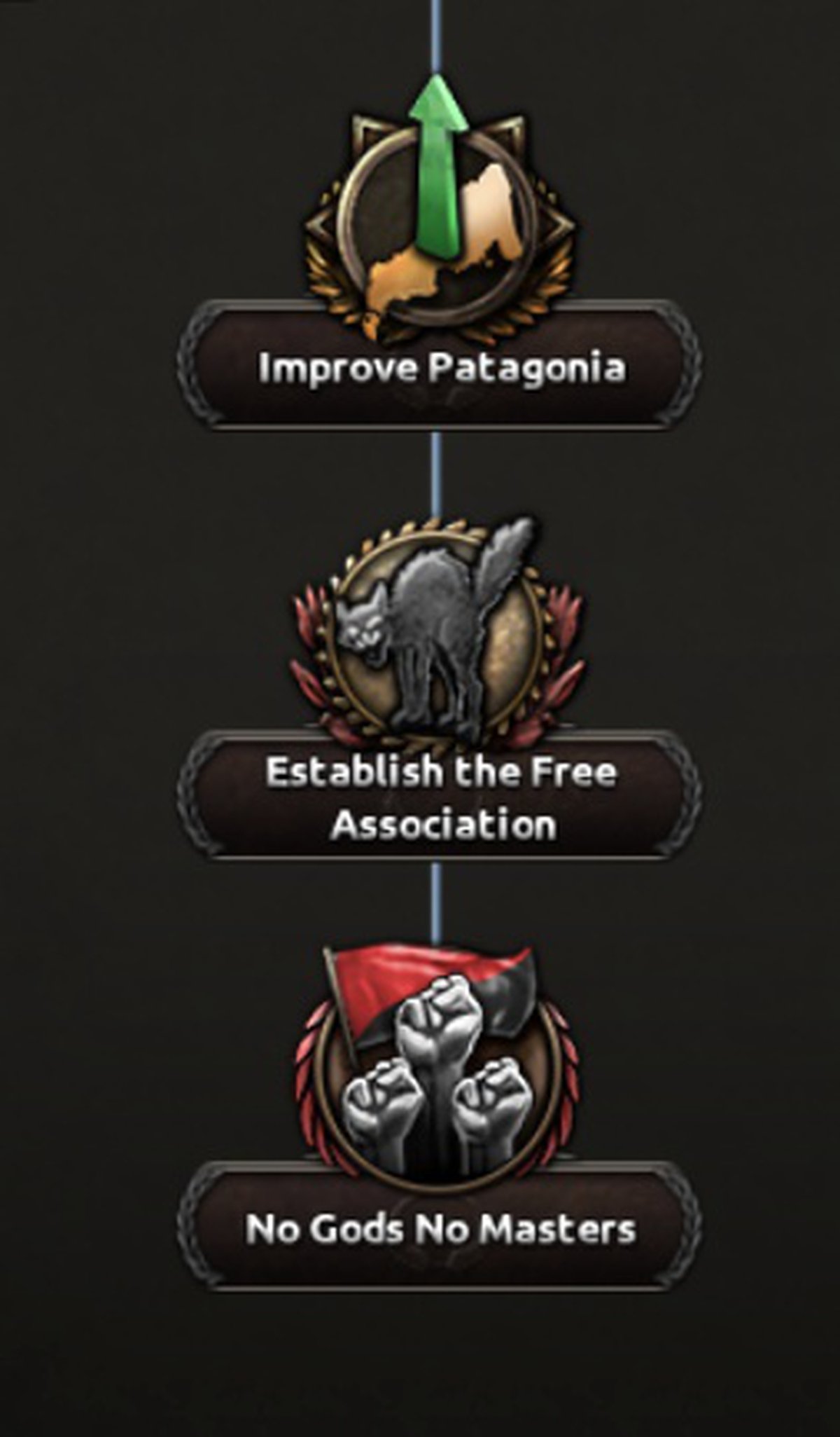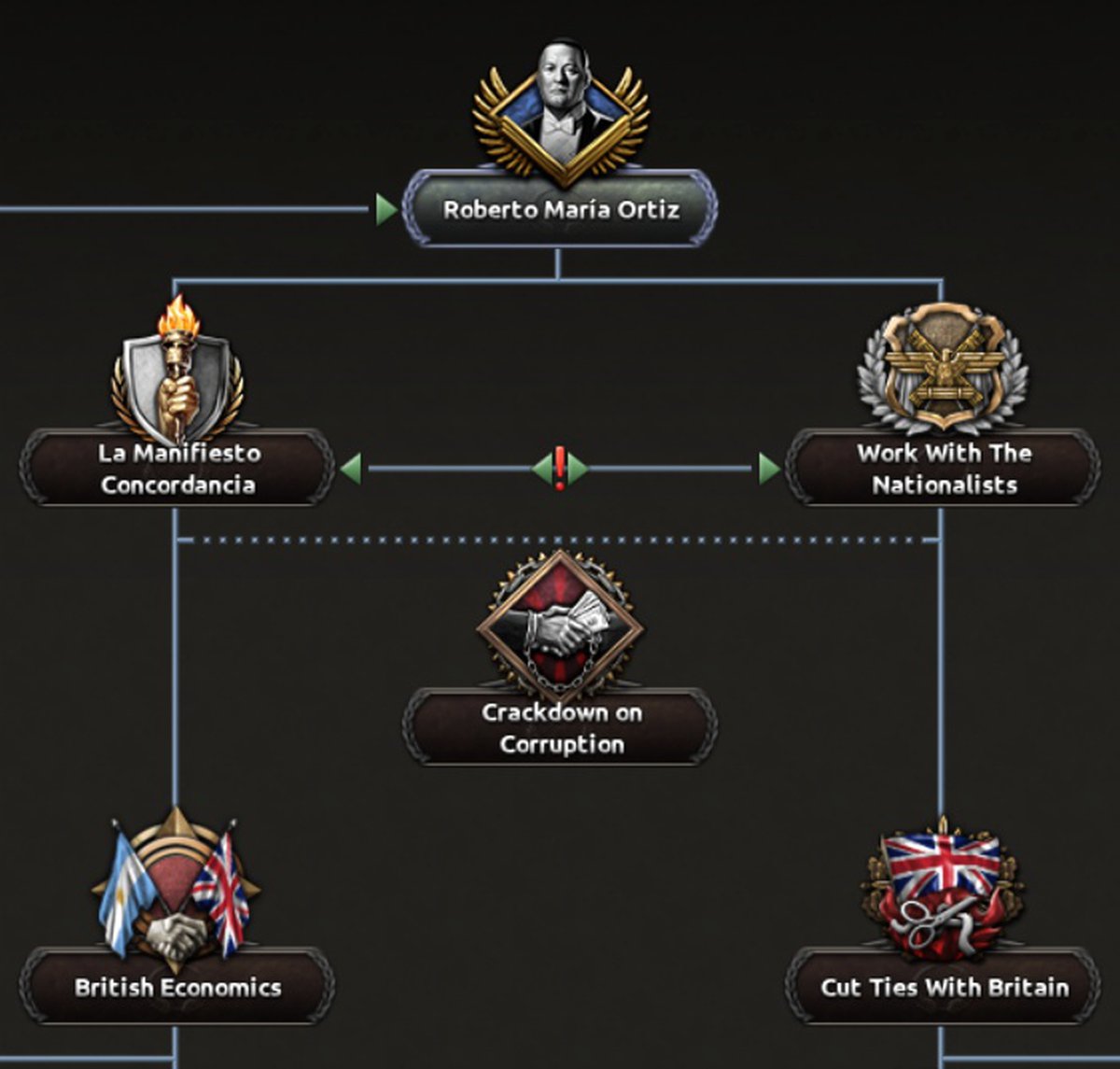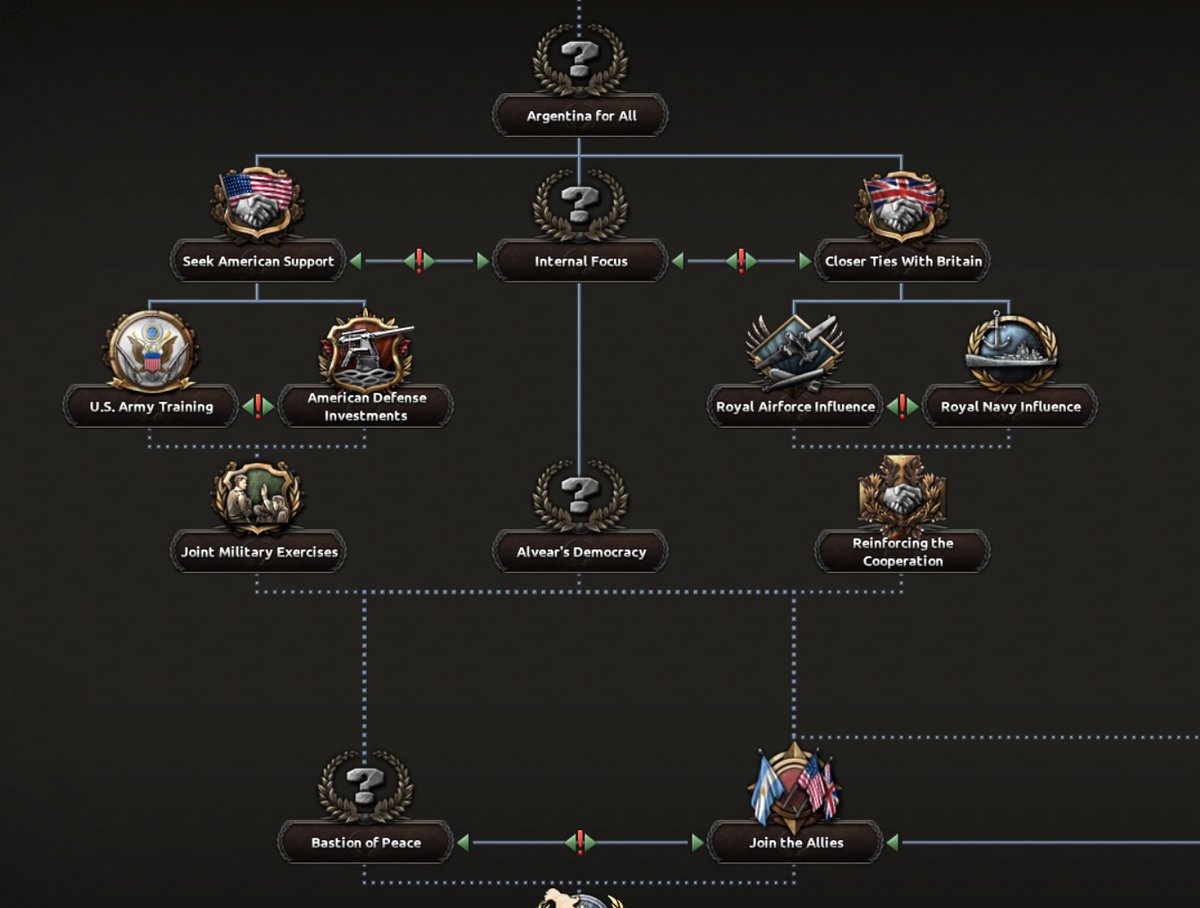Затем игроку-демократу стоит обратить внимание на развитие армии, укрепив связи с США или Великобританией. Также есть третья ветка, в которой Аргентина сосредотачивается на внутренней политике и пытается стать новым бастионом демократии в Америках.