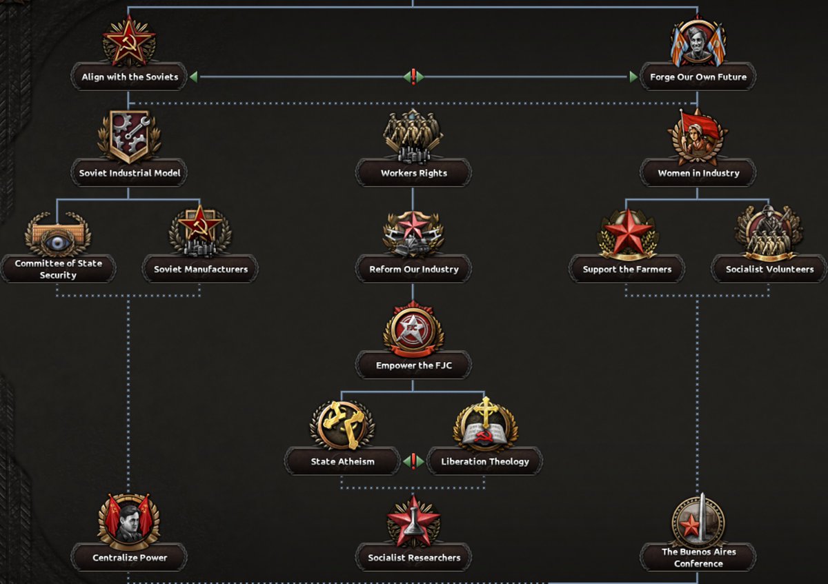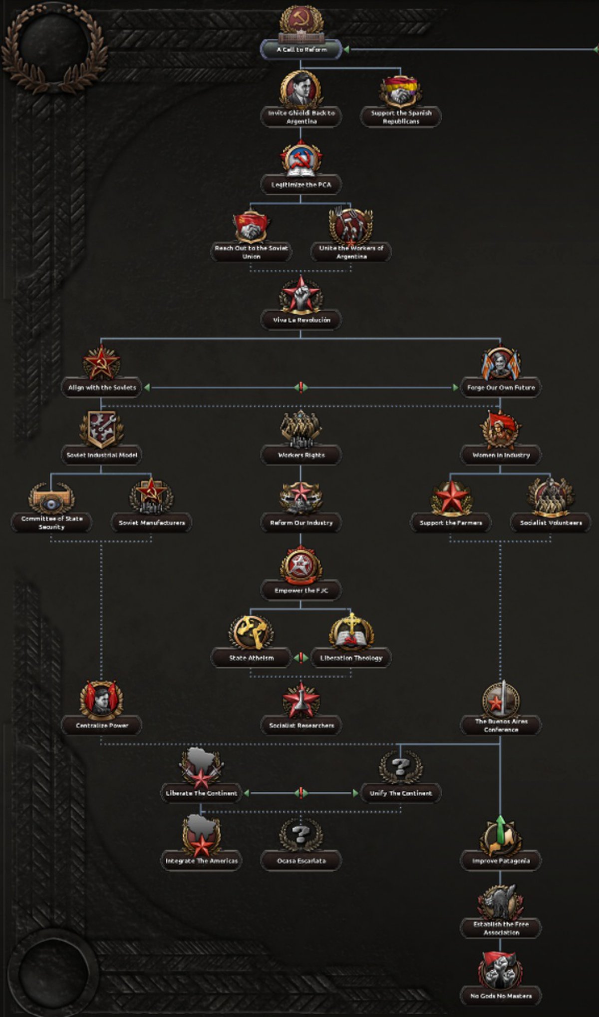 Затем можно выбрать один из двух вариантов. Встать на сторону СССР или делать независимую южноамериканскую социалистическую страну. В первом случае у власти останется Родольфо Гиольди, и Аргентина будет членом Коминтерна с доступом к советским конструкторам или военно промышленной организации, при наличии дополнения Arms Against Tyranny. Также усилия будут направлены на создание сильной разведывательной программы во имя госбеза. Гиольди же станет настоящим коммунистическим диктатором.