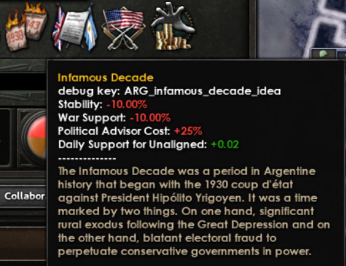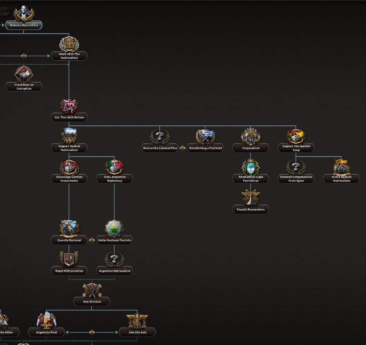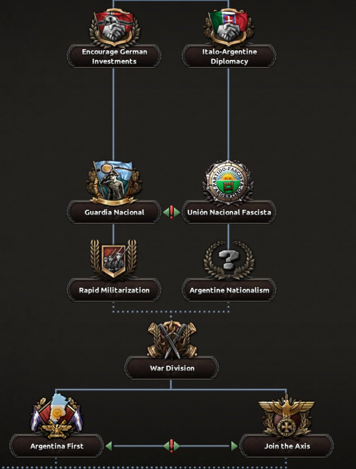 Затем можно инвестировать в Германию и договариваться с Италией. Далее стоит выбор между созданием националистической Аргентиной или Аргентиной, образца германского рейха. «Guardia Nacional» сделает Аргентину гипермилитаристской страной и даст возможность вступить в Ось, чтобы стать воплощением Германии на южноамериканском континенте.