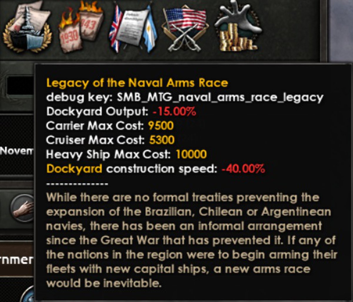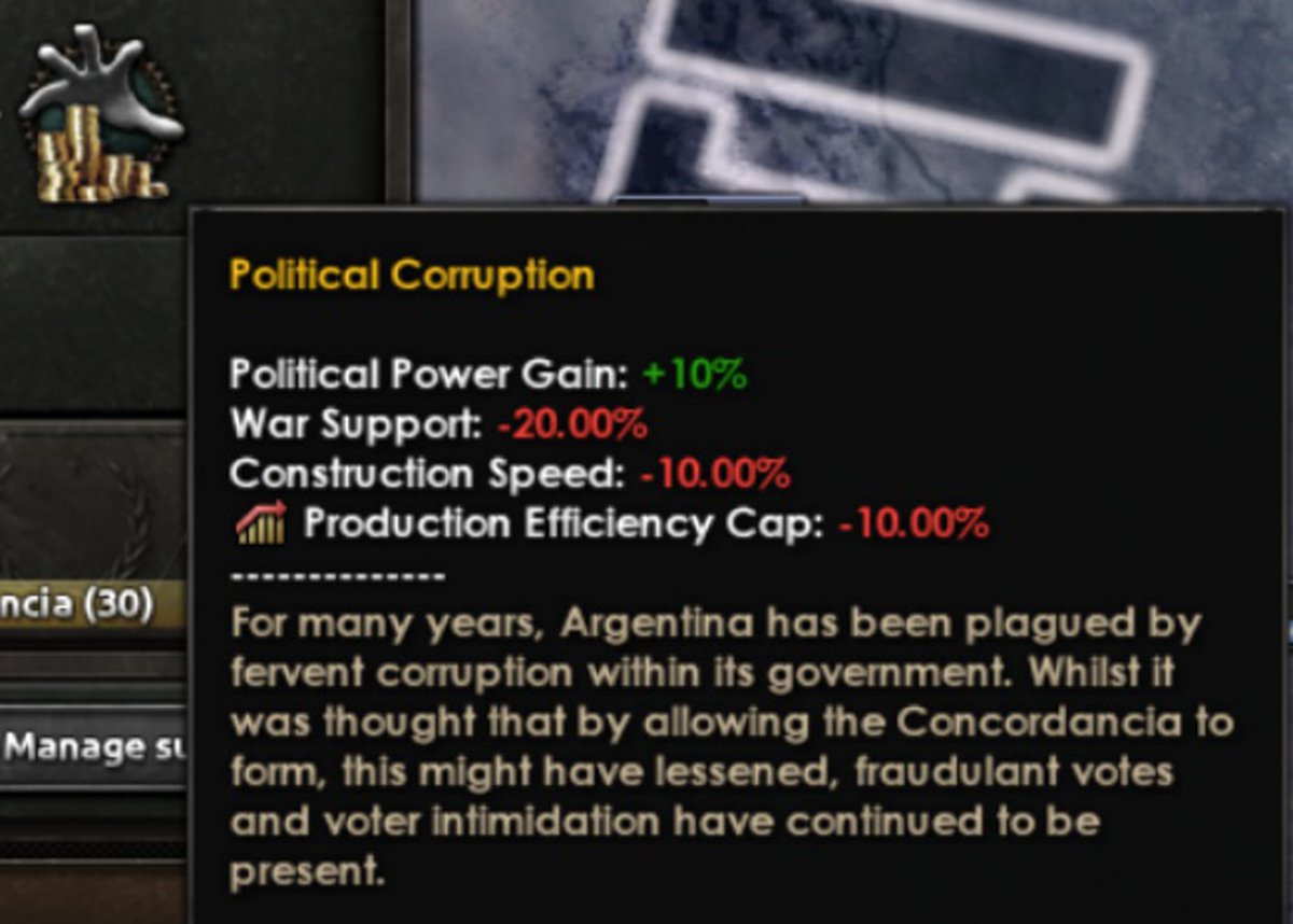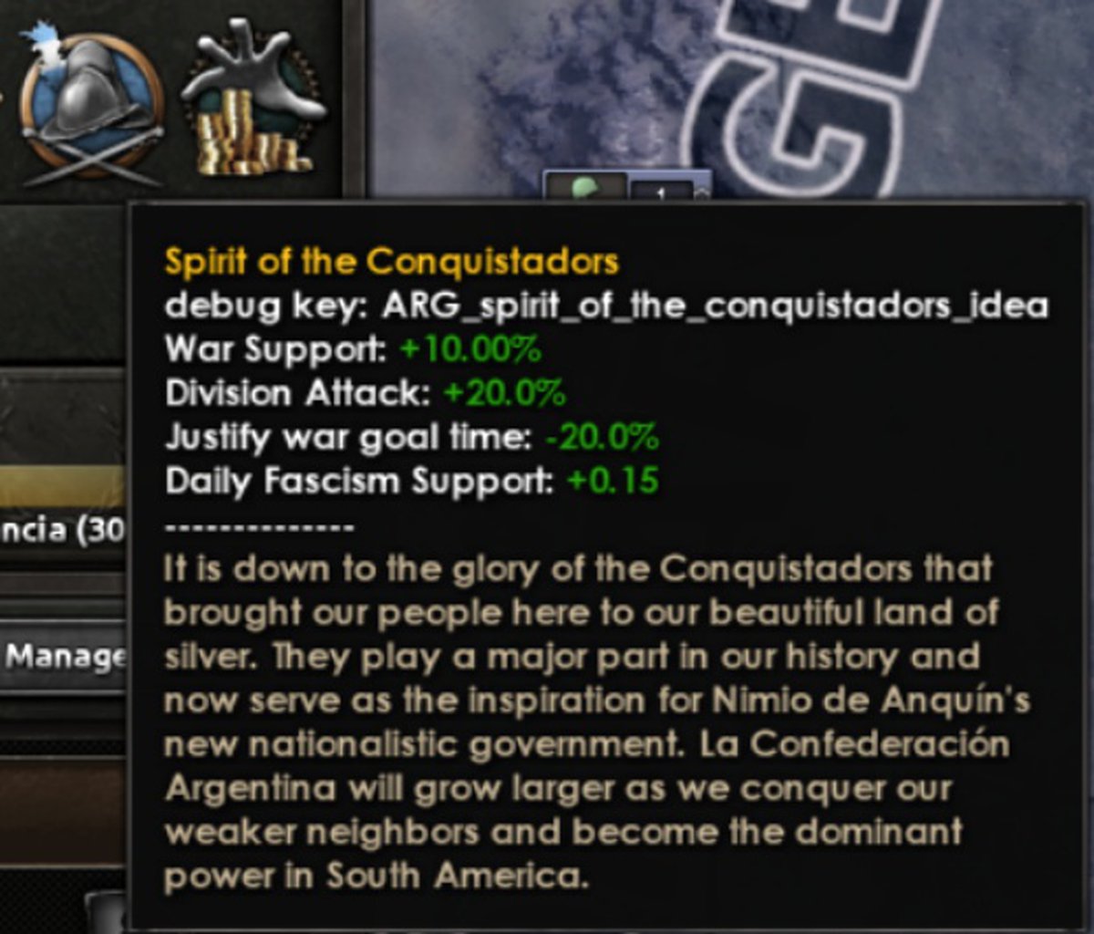 Затем можно инвестировать в Германию и договариваться с Италией. Далее стоит выбор между созданием националистической Аргентиной или Аргентиной, образца германского рейха. «Guardia Nacional» сделает Аргентину гипермилитаристской страной и даст возможность вступить в Ось, чтобы стать воплощением Германии на южноамериканском континенте.