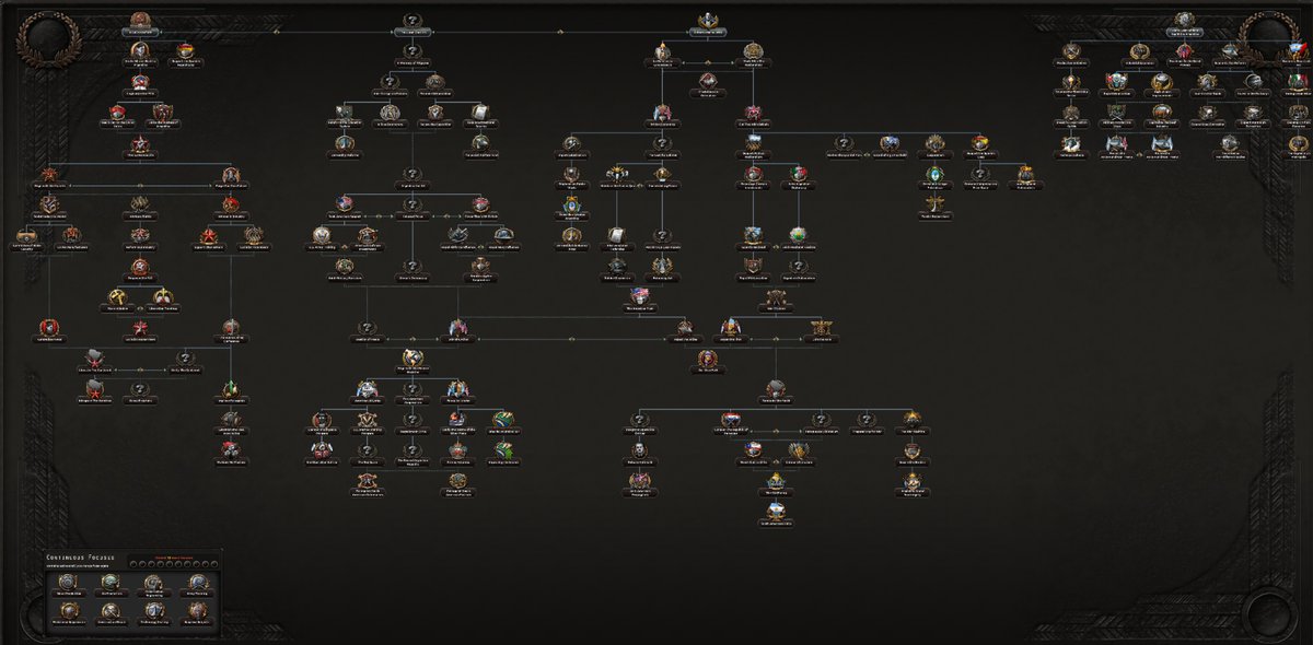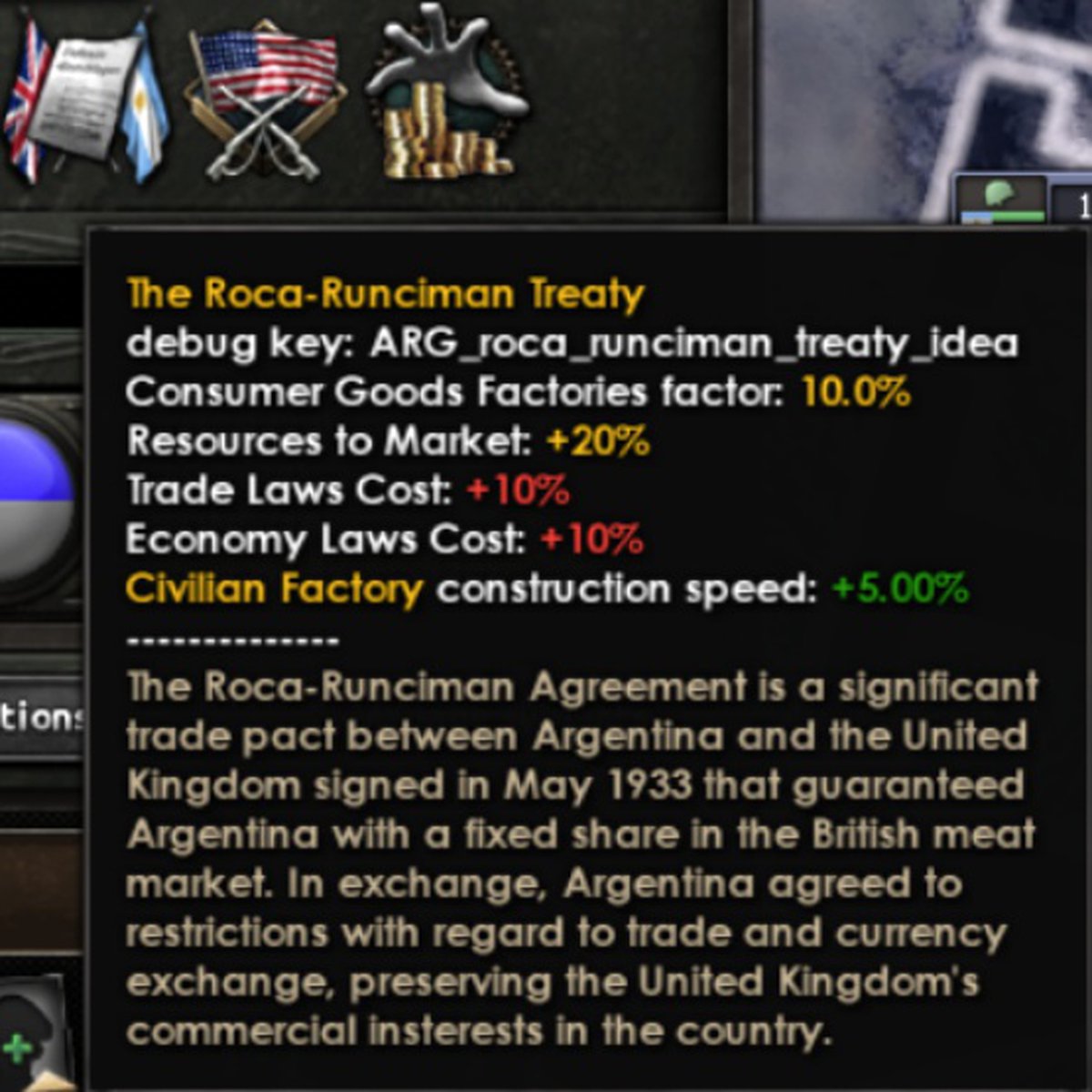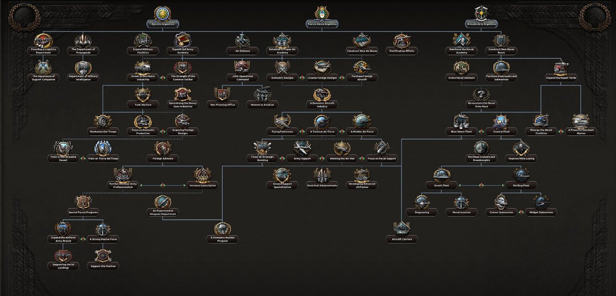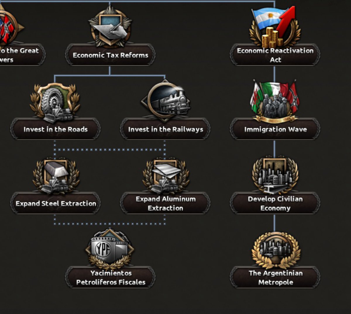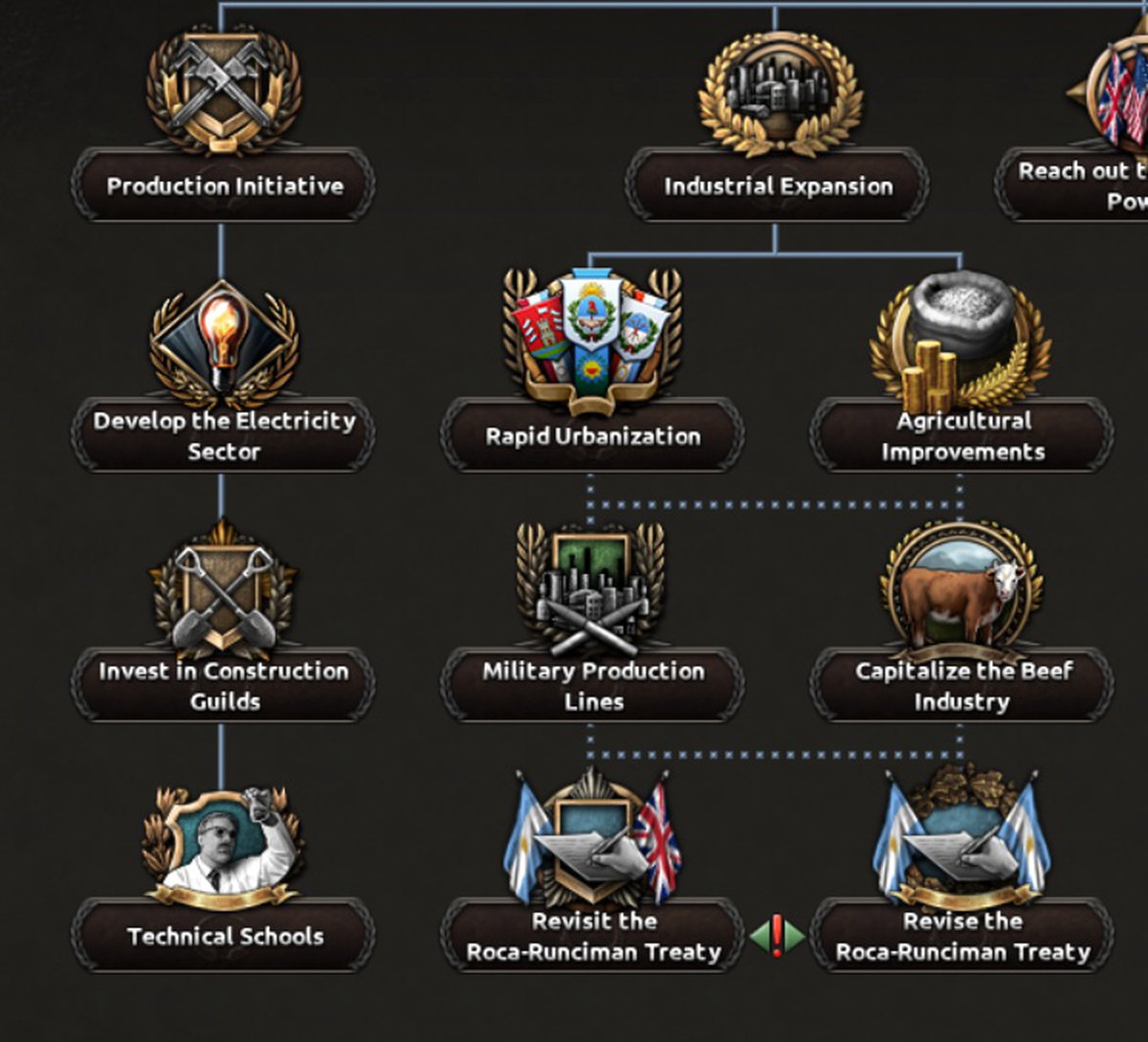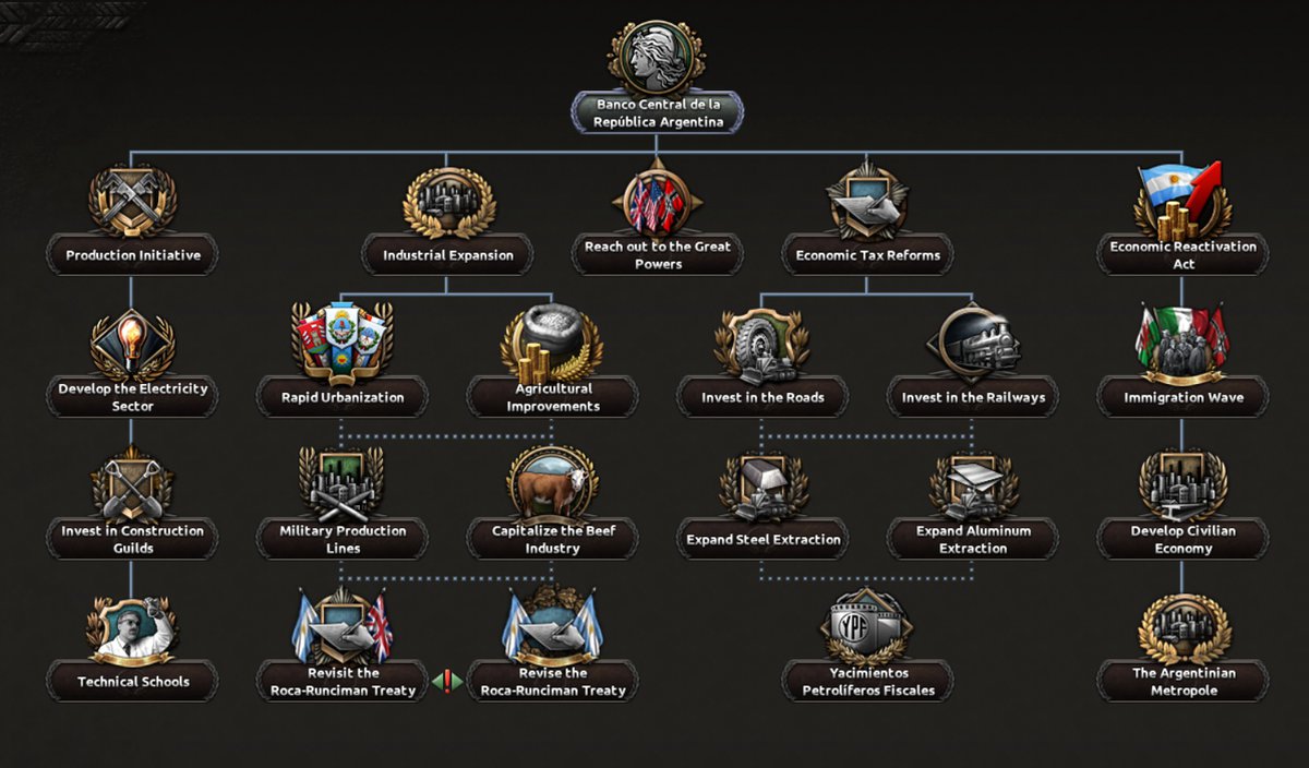 Есть ветки, посвящённые развитию промышленности и исследований. Множество фокусов дадут как гражданские, так и военные заводы. Будет возможность воспользоваться аргентинским производством говядины и внести правки в доступное с самого начала национальное «Соглашение Рока — Ренсимена». Можно превратить его в «Договор Эден-Малбрэна» или полностью пересмотреть его, исключив из него Великобританию и подписав соглашение с другими союзниками.