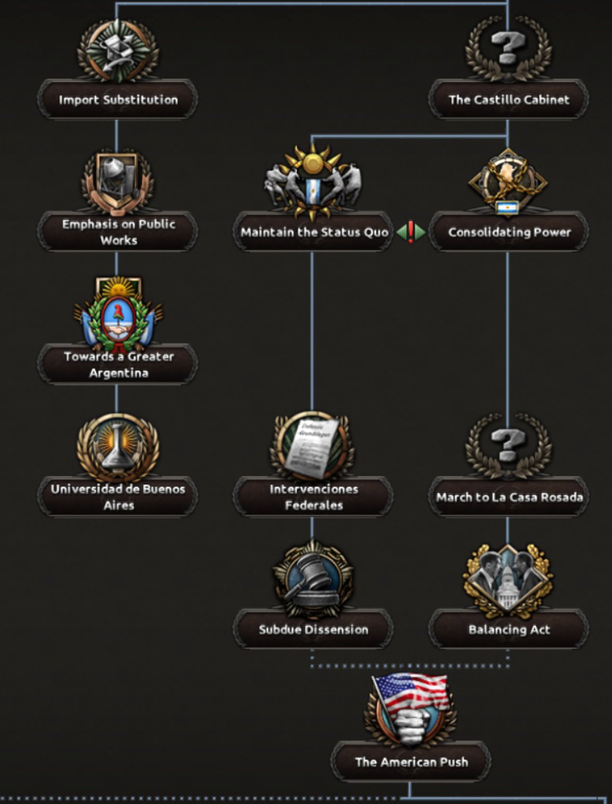 Промышленная ветка доступна всем идеологиям. Сначала идёт развитие Центрального банка аргентинской республики, потом в разных ветках имеется ряд бонусов для восстановления былой экономической мощи Аргентины до Великой депрессии.