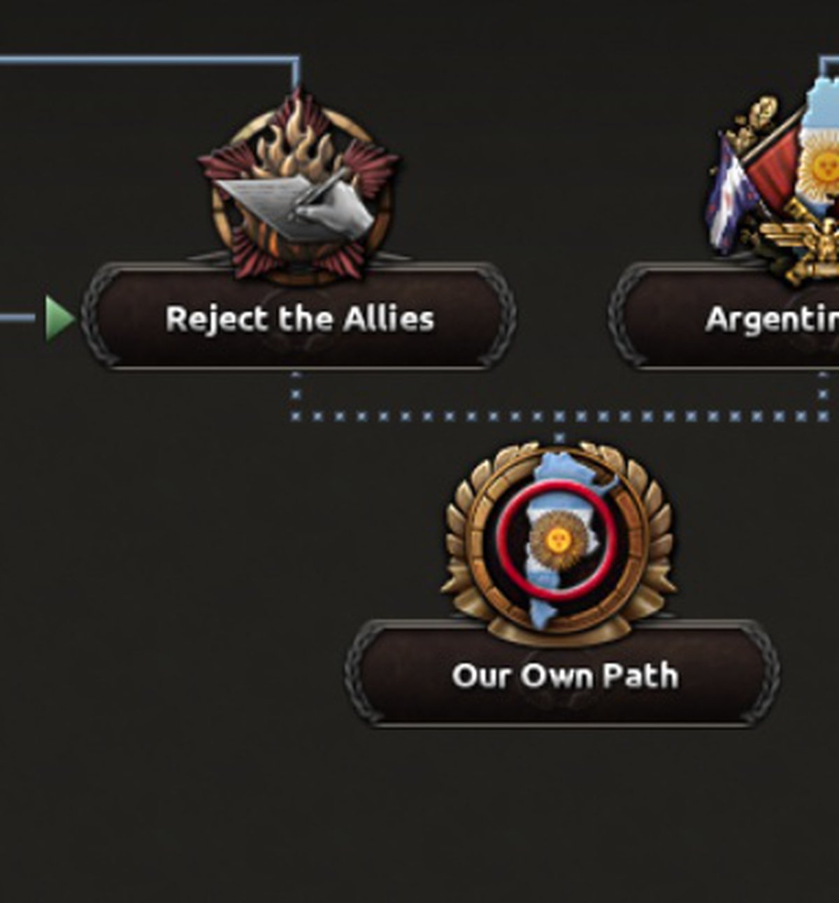 Этот путь завершается возможностью очистить континент от коммунизма. Или же можно отправить посла в Лондон и получить возможность захватить Фолклендские острова и остров Южная Георгия, превратив их в мощную морскую крепость, которая поможет в войне. Со временем можно получить поводы к войне против любой фашистской страны в Южной Америке.
