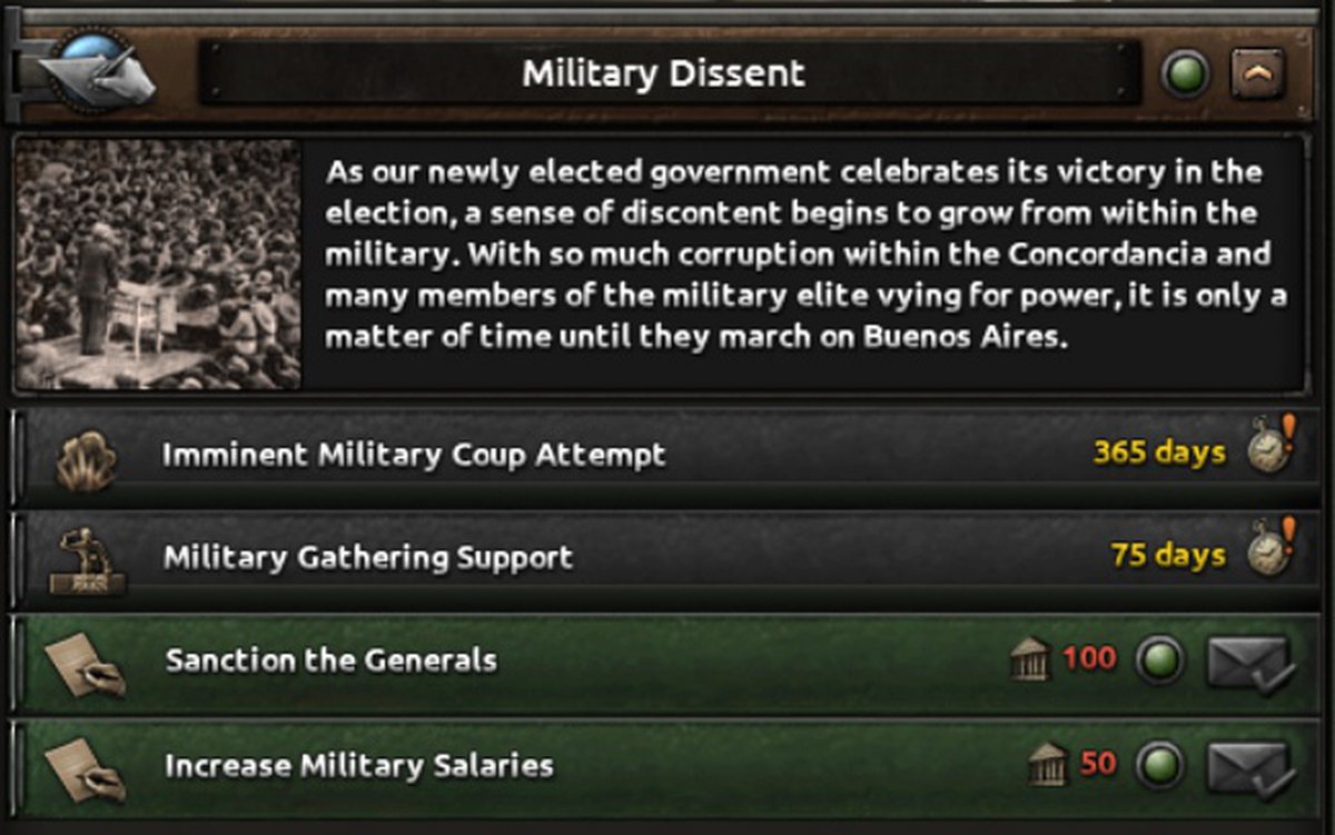 Это создаст напряженность в военных фракциях в правительстве, что запустит задание с обратным отсчётом, которое предвещает надвигающийся военный переворот. Если не присоединиться к фракциям или не оказать им сопротивление, то будет кровавая гражданская война по всей Аргентине.
