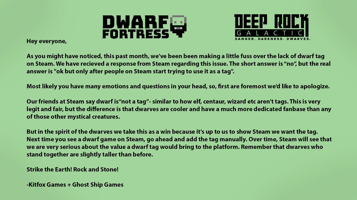 Авторы Dwarf Fortress и Deep Rock Galactic намерены добиться появления в магазине Steam официального тега «гном». Гномы — главные герои обеих игр, но команда Steam отказалась пойти навстречу авторам игр и добавить соответствующий тег в магазин.