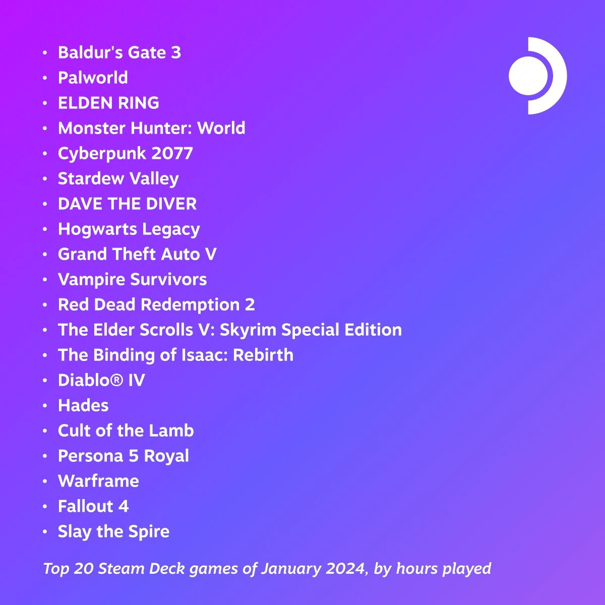 Valve опубликовала список игр, пользовавшихся наибольшей популярностью у владельцев консоли Steam Deck в январе 2024 года. Список уже традиционно возглавила Baldur's Gate 3, лидирующая в топе несколько месяцев подряд.