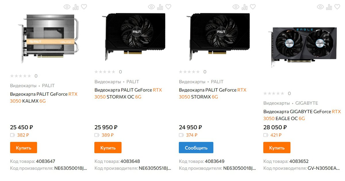 Продажи урезанной GeForce RTX 3050 стартовали по всему миру, включая Россию. Ритейлер Onlinetrade, например, продает карту за 25-28 тысяч рублей, за похожую сумму карту можно найти в Ситилинке.