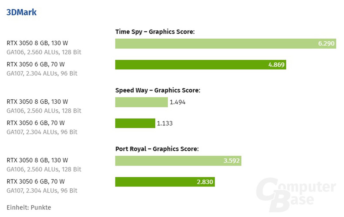 Издание сравнило производительность обычной GeForce RTX 3050 и урезанной версии видеокарты в бенчмарках 3D Mark. Во всех случаях урезанная видеокарта значительно уступила обычной версии: разница варьировалась от 21% до 24%.