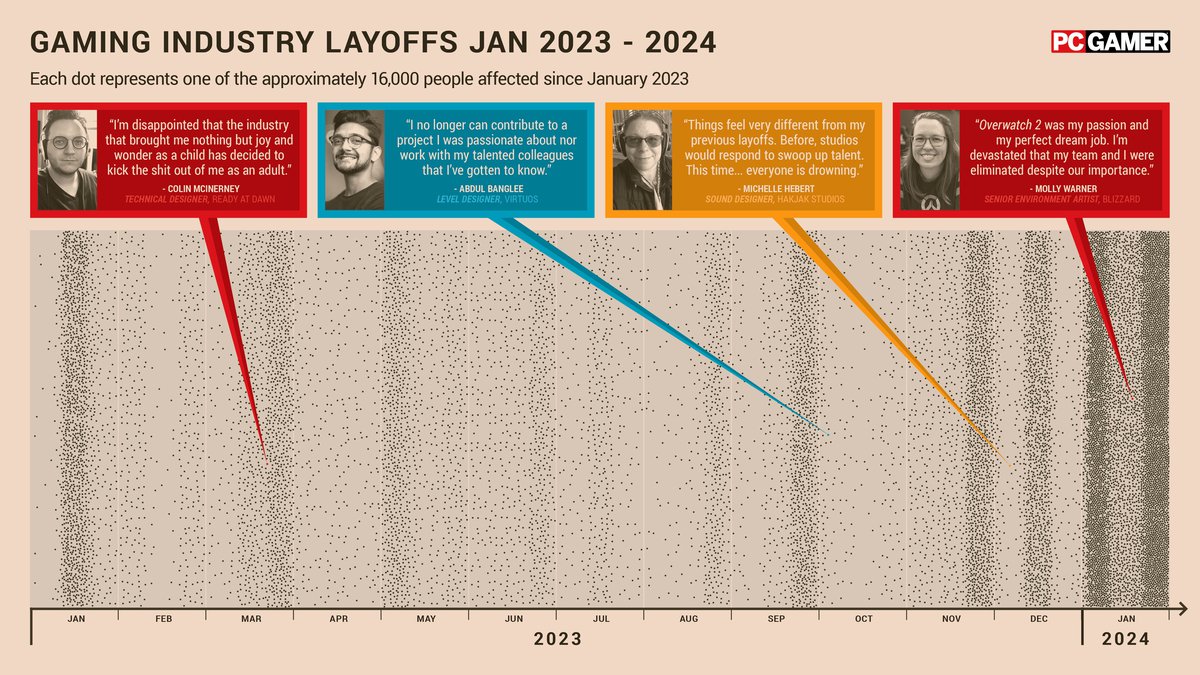 Начиная с 2023 года игровые компании активно сокращают штат: увольнения проходят и в небольших студиях, и в подразделениях компаний вроде Sony и Microsoft. Журналисты PC Gamer создали инфографику, чтобы показать, какое количество людей лишилось работы.