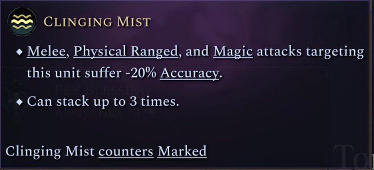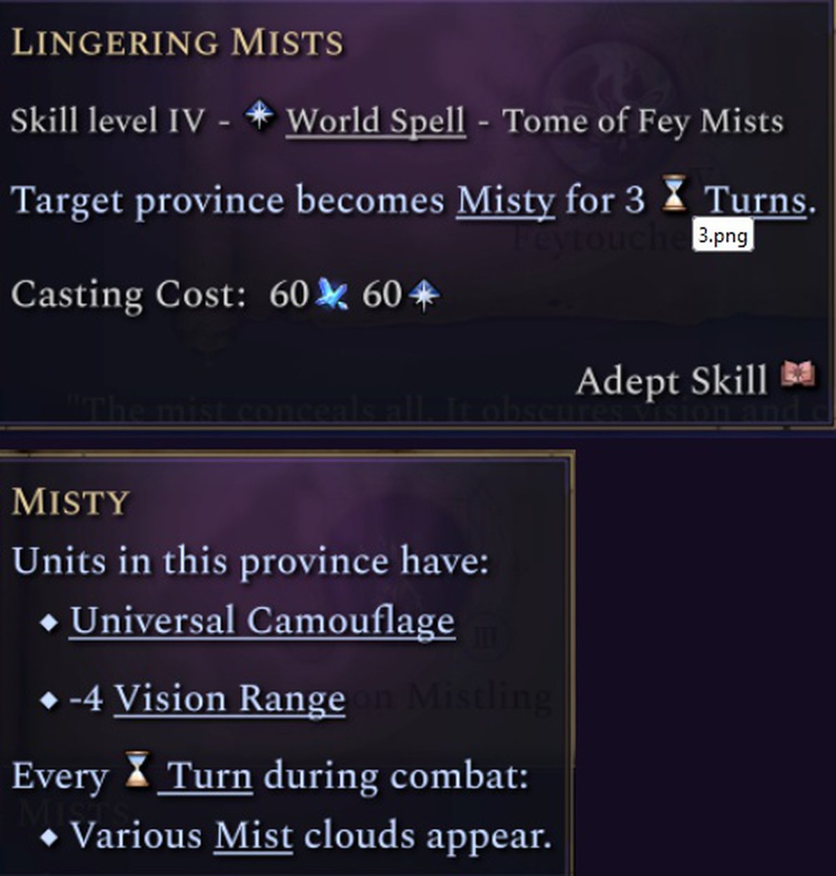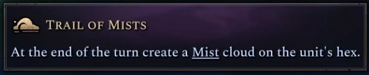 Кроме того, любые юниты, которые закончат ход в этой провинции получат эффект туманности. В них будет на 20% сложнее попасть. Эффект стакается до трёх раз. Распространяется на ближние, дальние и магические атаки.