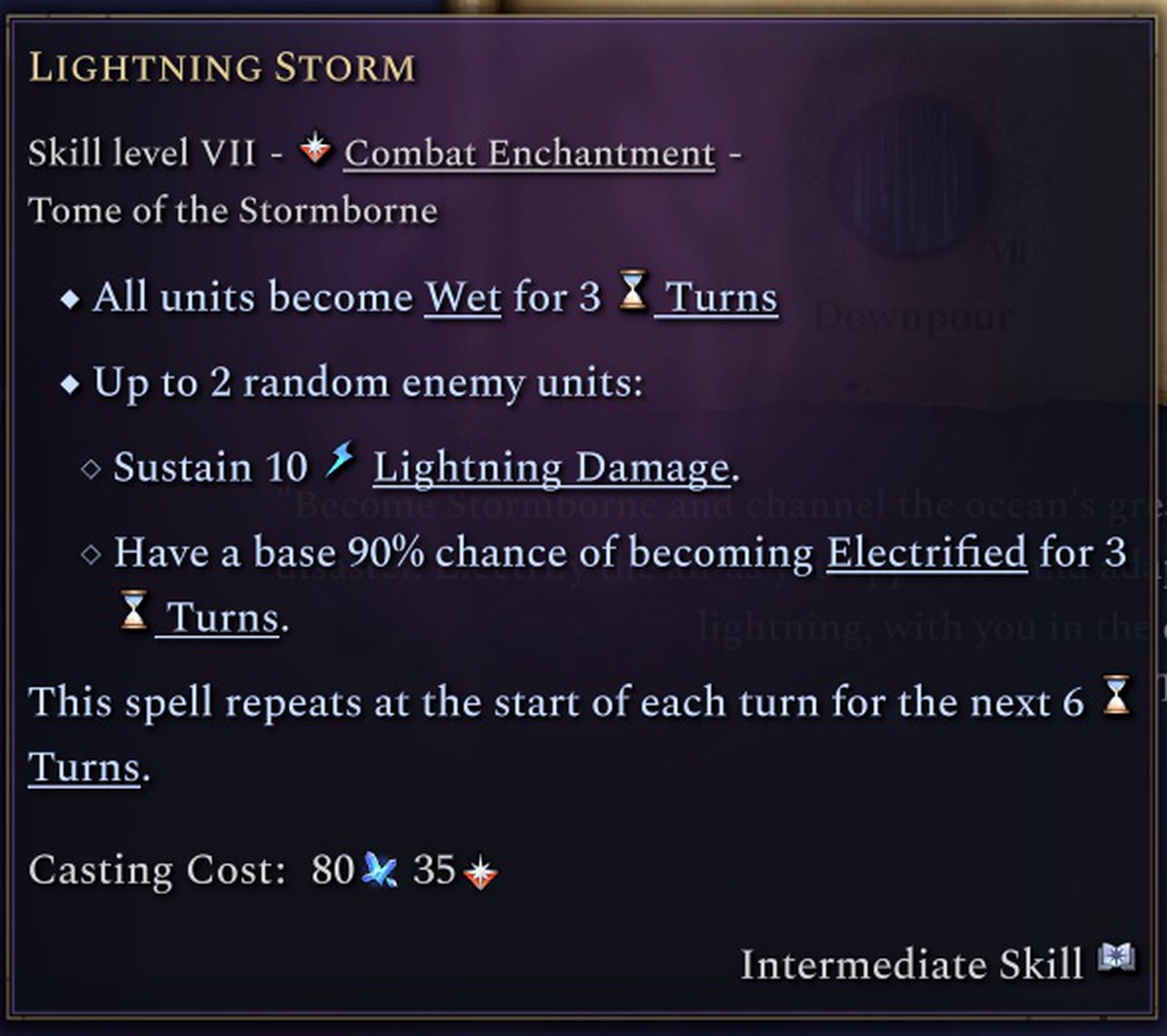 В ней есть заклинание грозового ливня. При его применении проходит дождик, все юниты намокают, а затем по двум врагам случайным молния бьёт. И это не всё, через шесть ходов гроза повторится. Конечно, такой наговор дорогой: 35 очков заклинаний и 80 маны стоит.