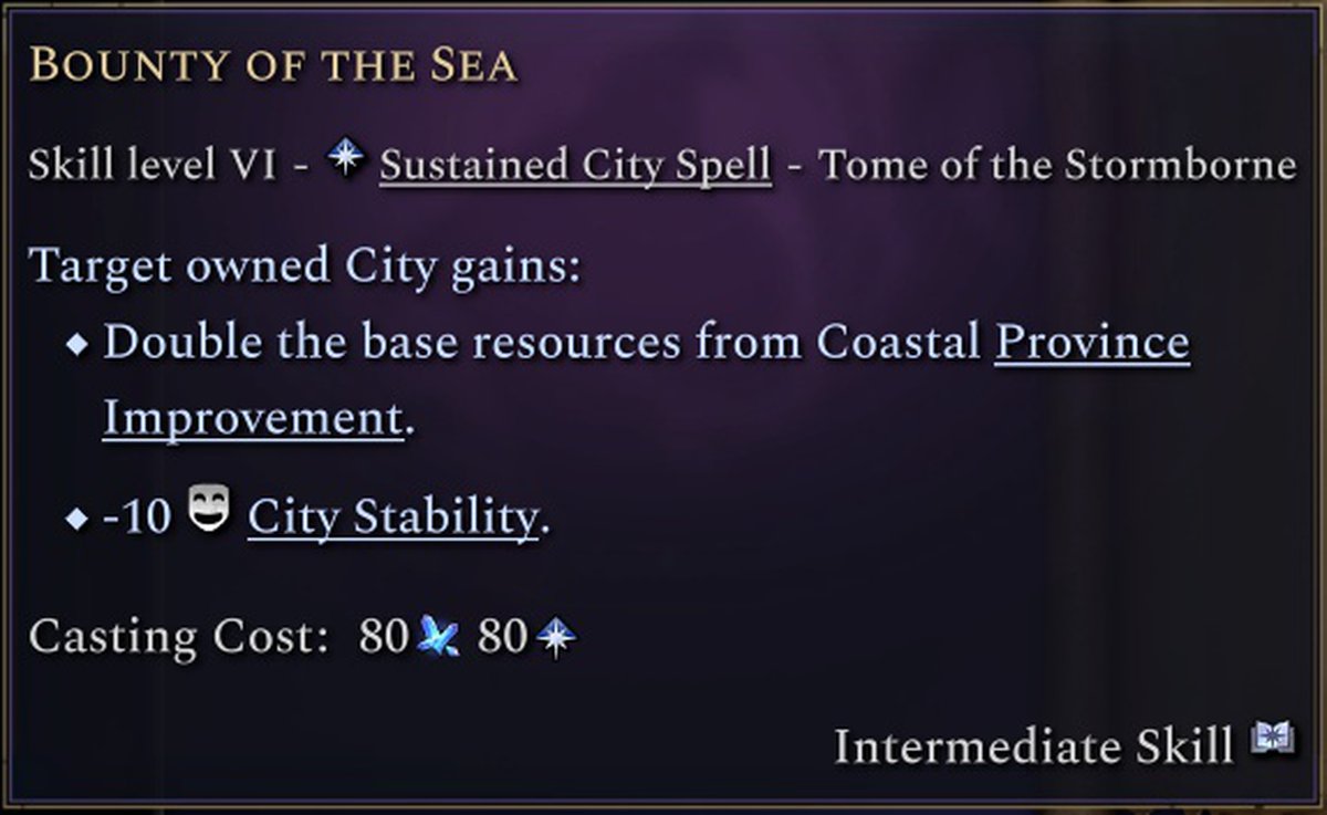 Имеется 2 экономических заклинания. Т.е. они вешаются на город и улучшают доходы. "Дар моря" (Bounty of the Sea) повышает выхлоп в улучшенных прибрежных провинциях в два раза. Счастье населения, правда, снижается на 10.