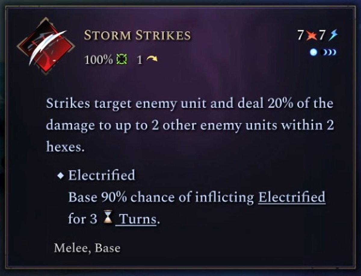Рукопашная атака бьёт физическим уроном и электрическим, соседние вражеские юниты получат 20% урона. Есть 90% шанс наэлектризовать, как минимум, цель. Неясно, будет ли эффект на соседей ложиться.