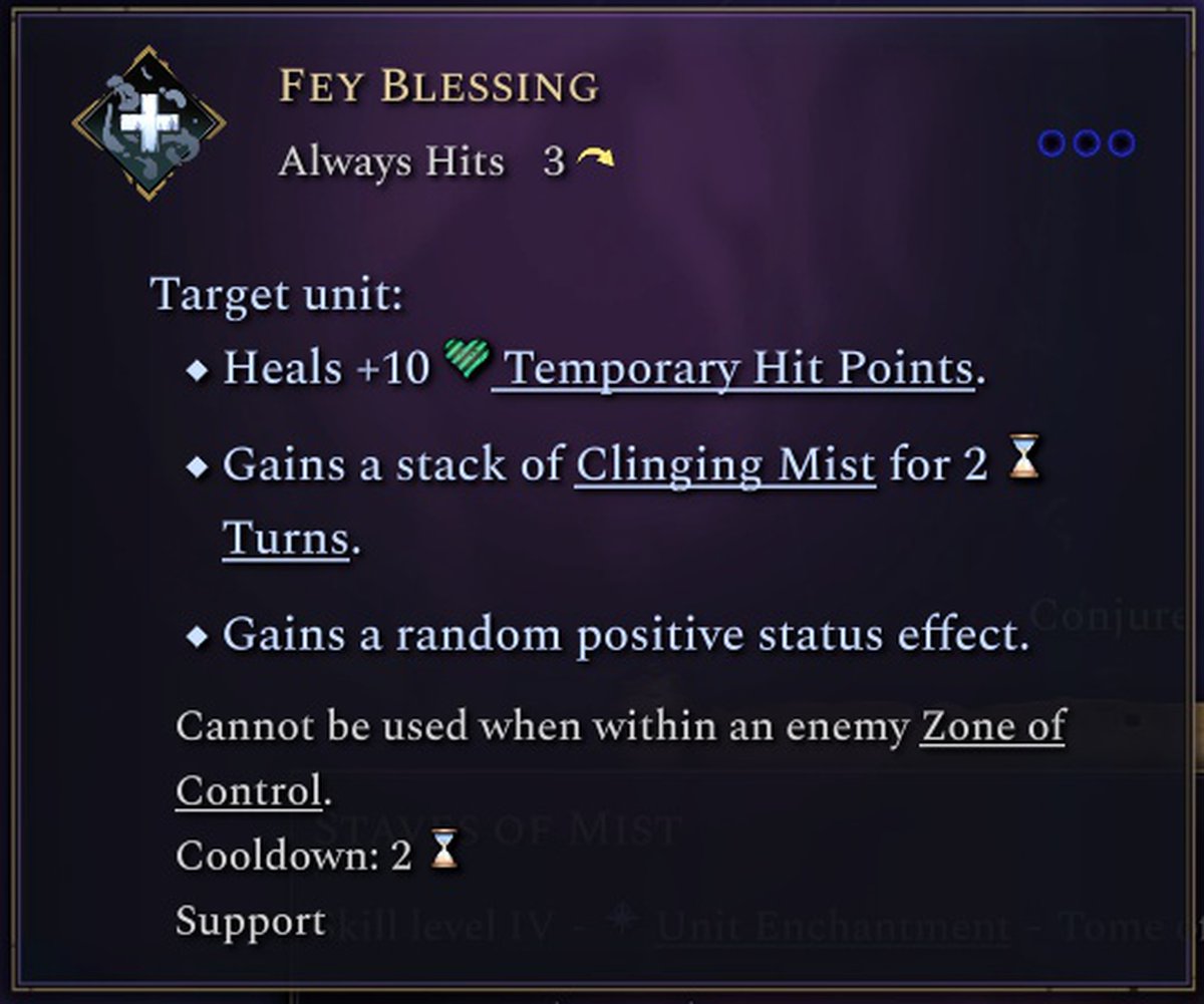Заклинание "Посохи тумана" (Staves of Mist на скриншоте) - это исследование. Оно даст юнитам поддержки фракции способность дать цели 10 единиц временного здоровья (такова механика боевого лечения в игре, что после сражения это здоровье пропадёт), эффект всё того же туманного уклонения на 2 хода и один случайный положительный эффект.