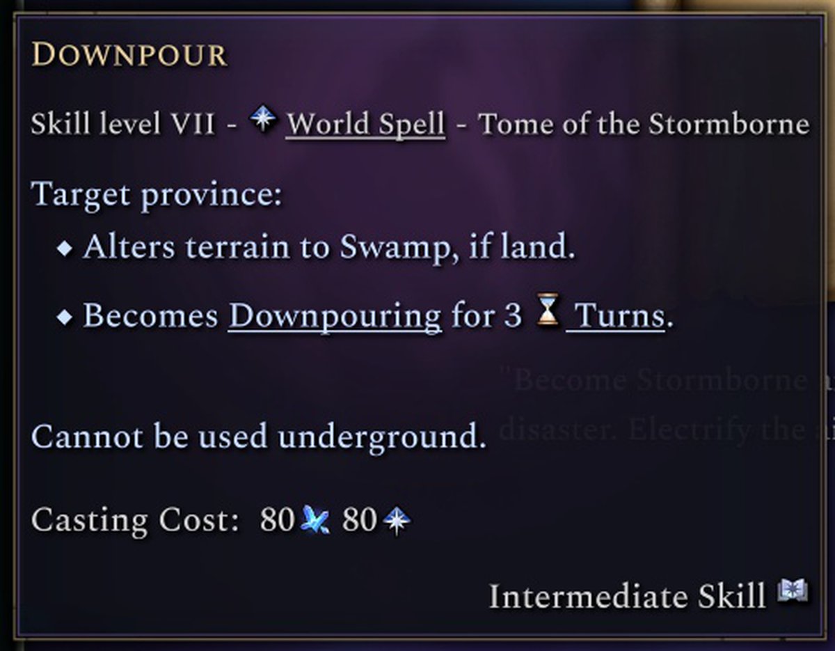 На глобальной же карте можно намочить целую провинцию другим заклинанием. Там все будет мокрыми, и ландшафт может измениться. Если была земля, то станет болотом на 3 хода. Однако такой дождик нельзя применить в подземке.