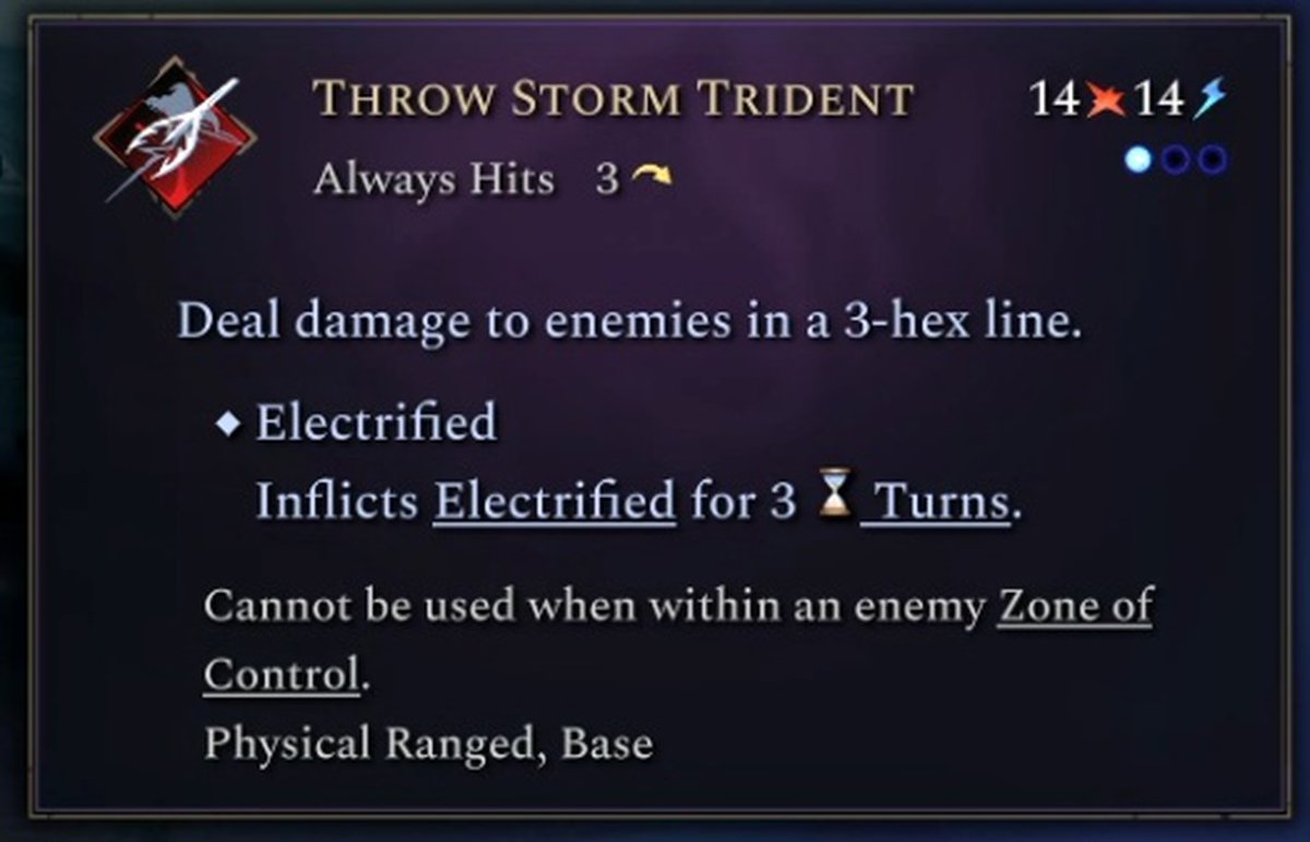 Дистанционная атака - бросок электрического трезубца с пробиванием до трёх целей насквозь по прямой, а также наложением эффекта наэлектризованности, разумеется.