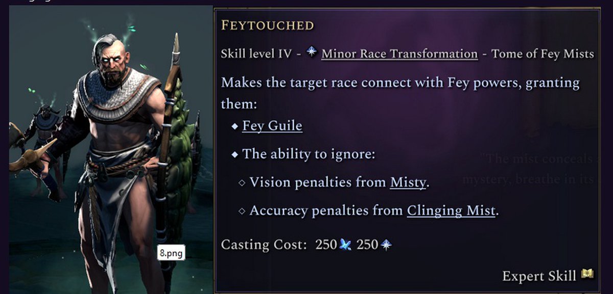 Как известно, книги магии позволяют изменять расу игрока. Заклинание "Те, кого коснулись феи" (Fey Touched) не только слегка изменит внешний вид всех юнитов, но также позволит игнорировать тот самый эффект уклонения на врагах. Т.е. противник всё ещё будет получать бонусы от тумана, но против туманного мага это ему не поможет. И туман обзору трансформировавшимуся народу больше мешать не будет.