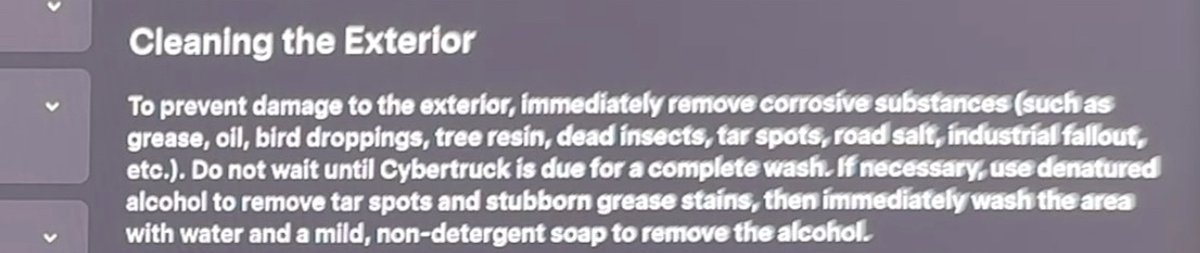 В руководстве по эксплуатации Cybertruck упоминается, что корпус пикапа может покрываться ржавчиной. Чтобы избежать этого, рекомендуется удалять с корпуса коррозионные вещества: птичий помет, масло, смолу деревьев, насекомых и так далее. Это советуют делать сразу же, не дожидаясь мойки.
