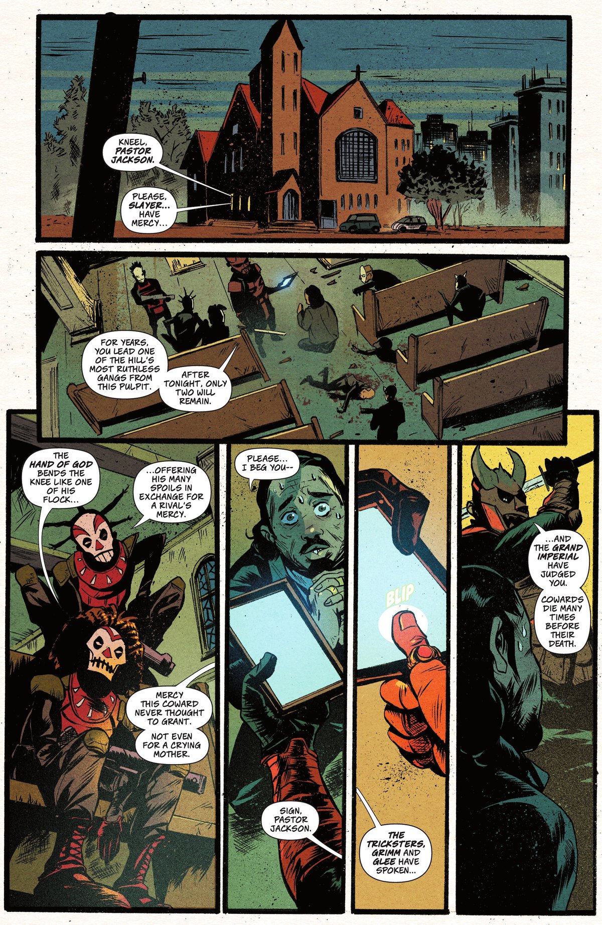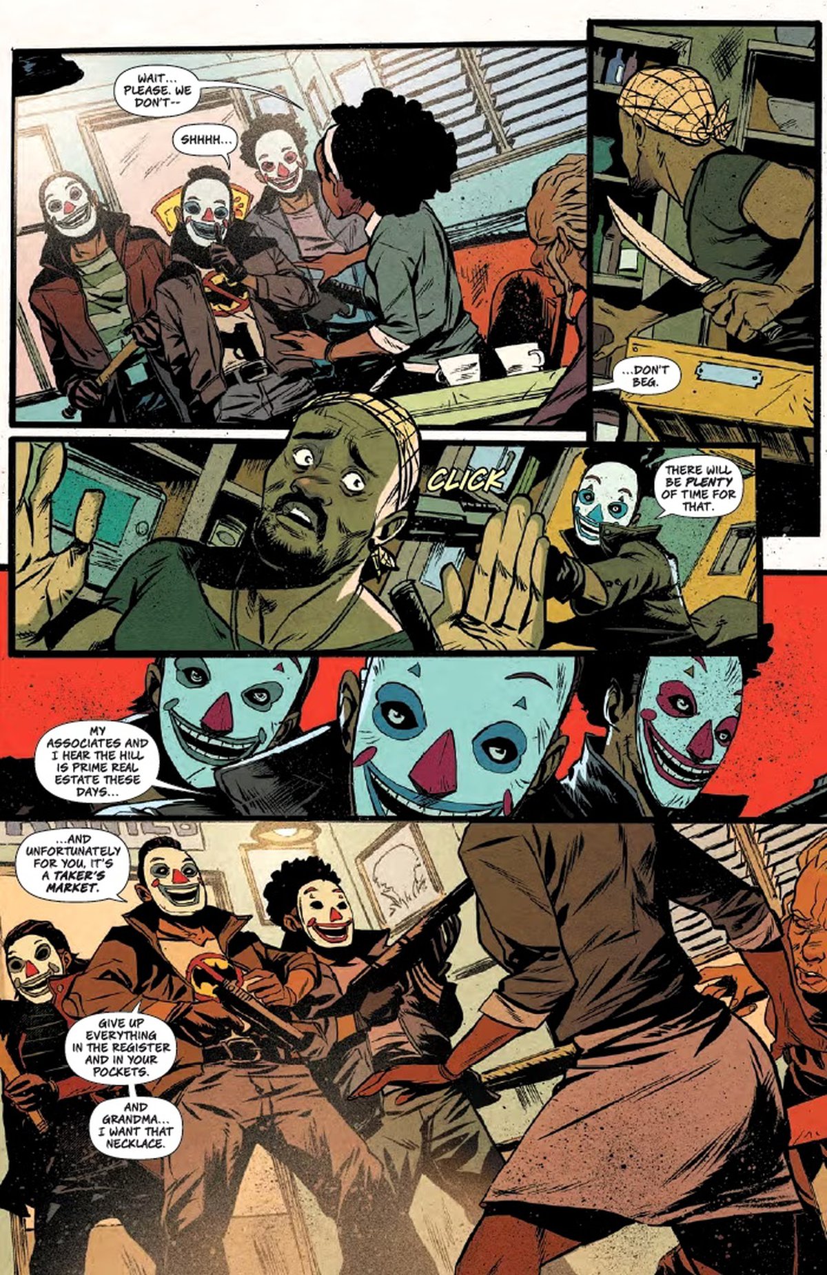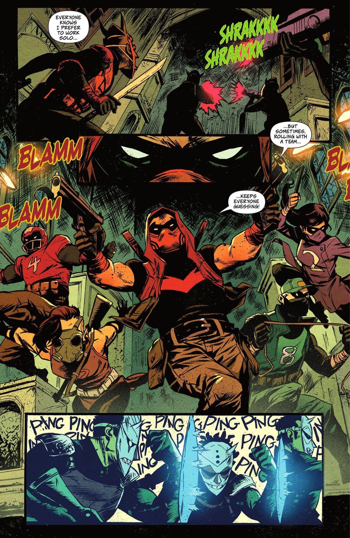 Я подумал, что это будет интересная тема для комикса. И связывая это с Войной Джокера, которая была очень безумным событием, похожим на чистку, когда разные люди бегали в масках, вызывая хаос, я подумал: «Что, если бы вы жили по соседству и увидели это, и люди начали объединяться, чтобы защитить район от грядущего нападения?»