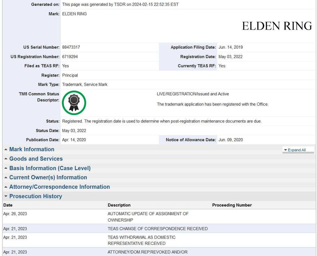 Официально From Software и ее материнская компания, холдинг Kadokawa, не комментировали получение прав на торговую марку Elden Ring.