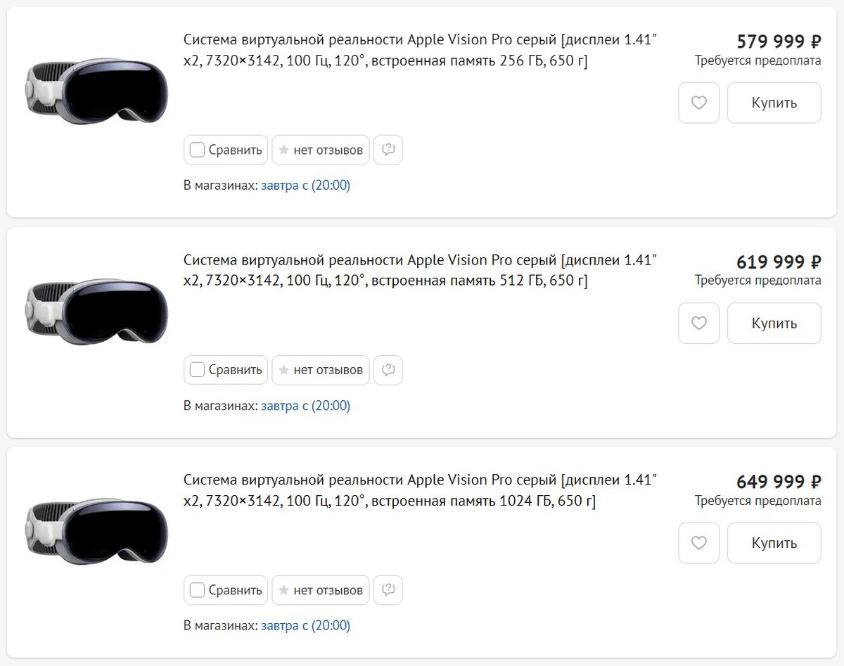 Самая дешевая версия Apple Vision Pro обойдется в 579999 рублей: у этой модели устройства 256 гигабайт встроенной памяти. Модель с 512 гигабайтами памяти стоит 619999 рублей, версия с 1024 гигабайтами стоит 649999 рублей.