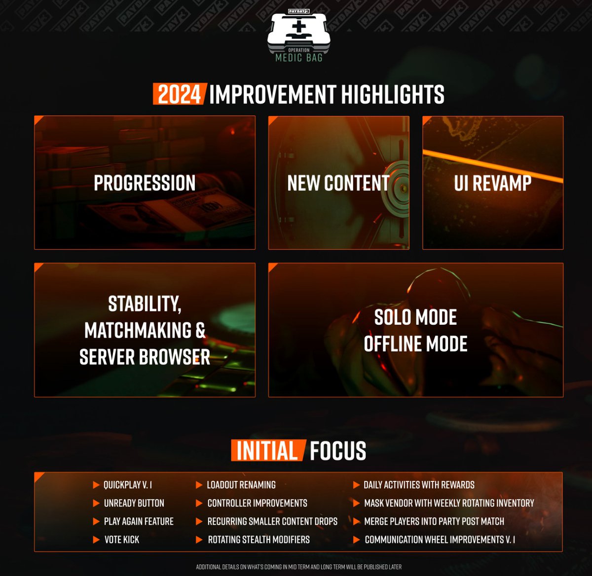 Разработчики кооперативного шутера Payday 3 рассказали о планах по поддержке игры в 2024 году. Проанализировав требования фанатского сообщества, разработчики опубликовали перечень возможностей, которые попадут в Operation Medic Bag.