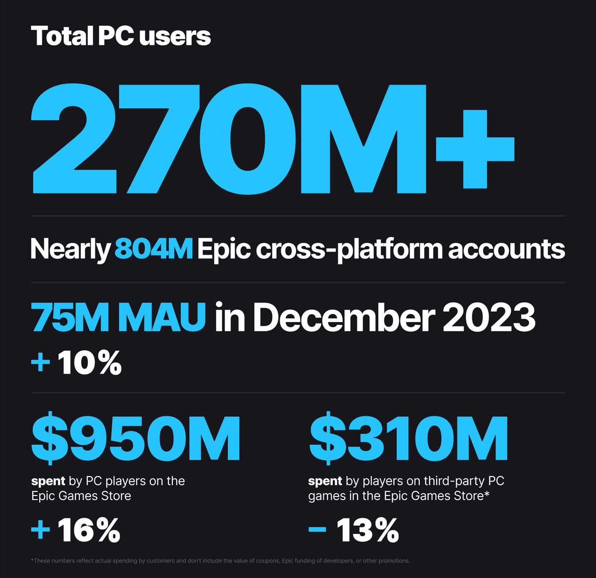 За 2023 год игроки потратили в магазине $950 миллионов, на 16% больше, чем в 2022 году. Примечательно, что на игры сторонних разработчиков потратили $310 миллионов, на 13% меньше, чем год назад, то есть Epic Games заработала на магазине заметно больше, чем годом ранее.