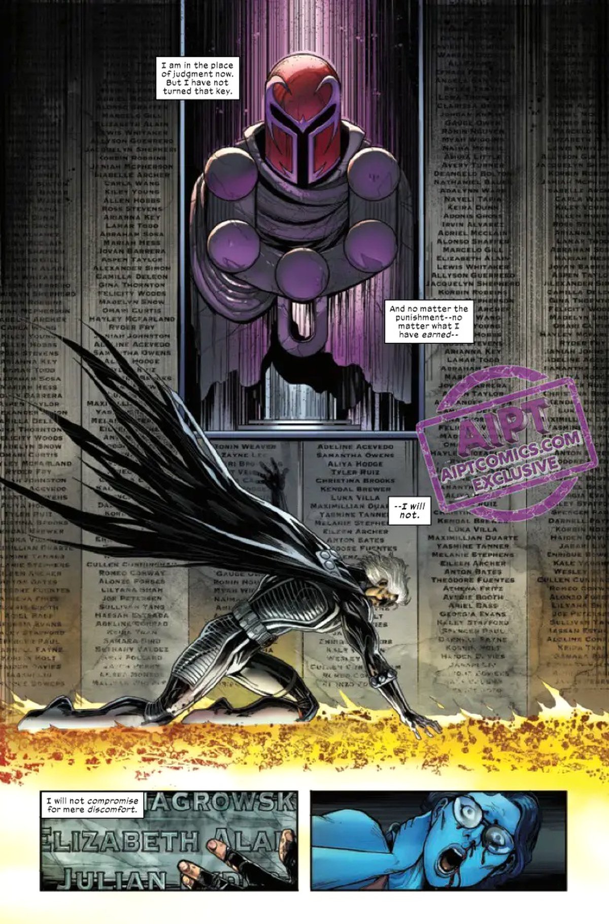 И сейчас Магнето находится в загробном мире, в месте суда, где он ползает по лавовой реке, вдоль стены, на которой написано много имён, и на которой есть отделение с его старым обмундированием. Расскажите в комментариях, что это за имена, и в чём символизм, если у вас имеется нетривиальная версия. В любом случае, какое бы наказание Максу здесь не назначили, он не хочет пробовать использовать ключ.