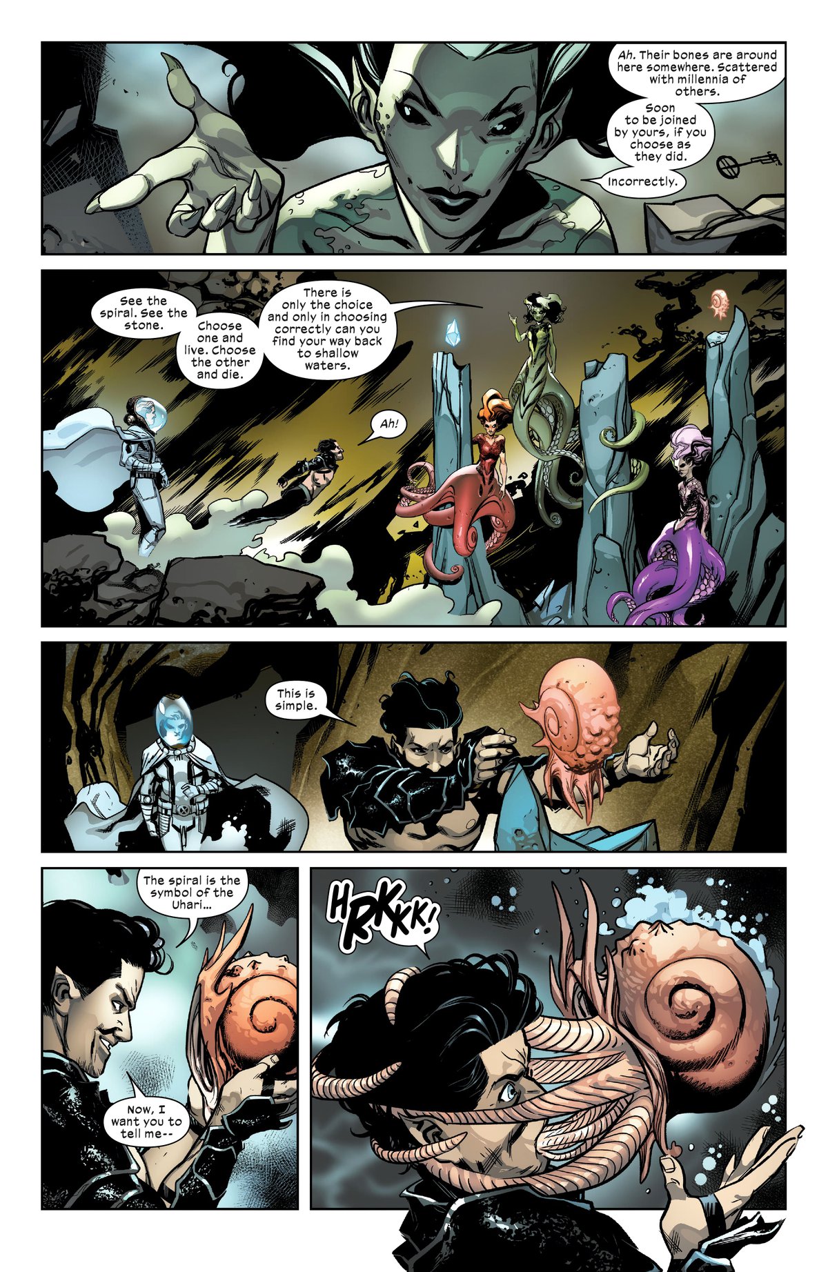 На превью Макс вспоминает события комикса Giant-Size X-Men: Magneto 2020 года, и к ним нам тоже придётся обратиться для контекста. Тогда Магнето с Нэмором отправился в какую-то подводную пещеру. Некие огромные медузы предложили правителю Атлантиды сделать выбор между тремя постаментами: на одном был кристалл, на другом ничего, на третьем улитка. За неправильный выбор смерть. Нэмор взял улитку, и это неправильно.