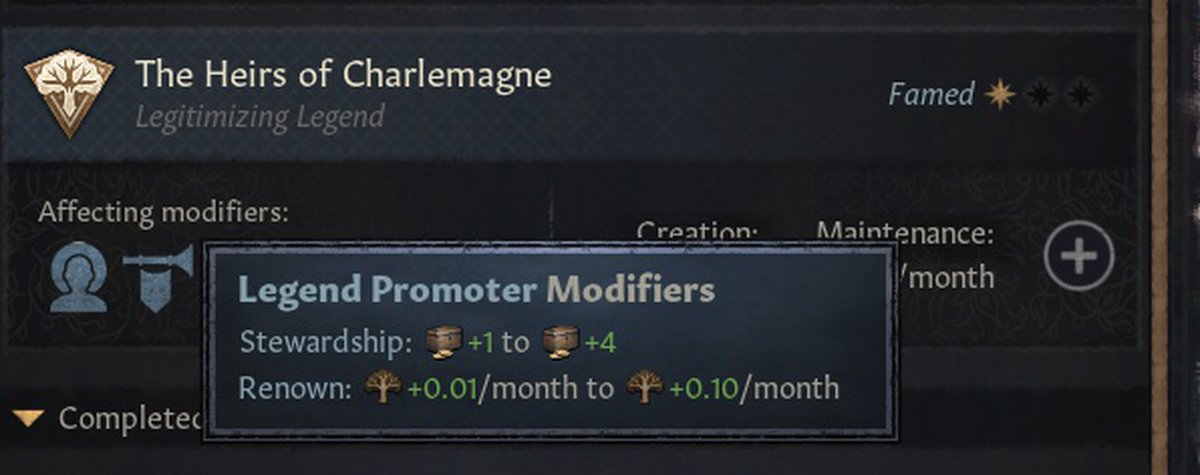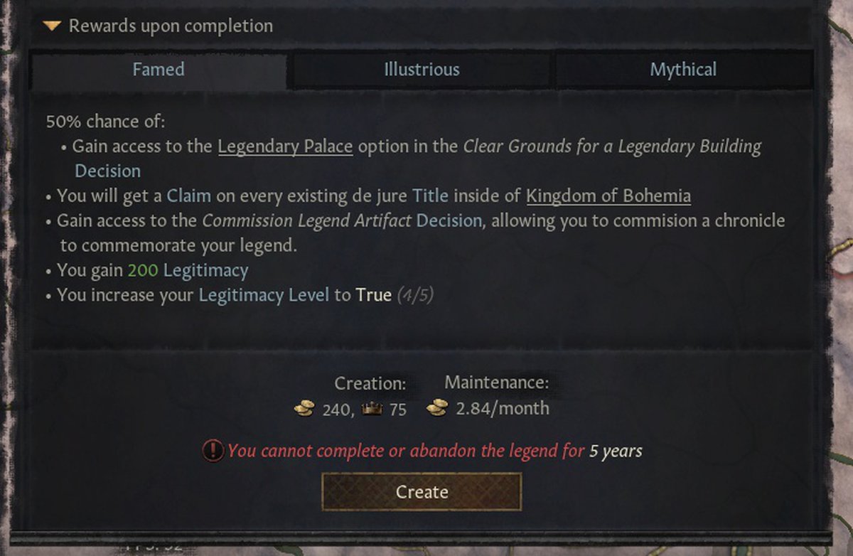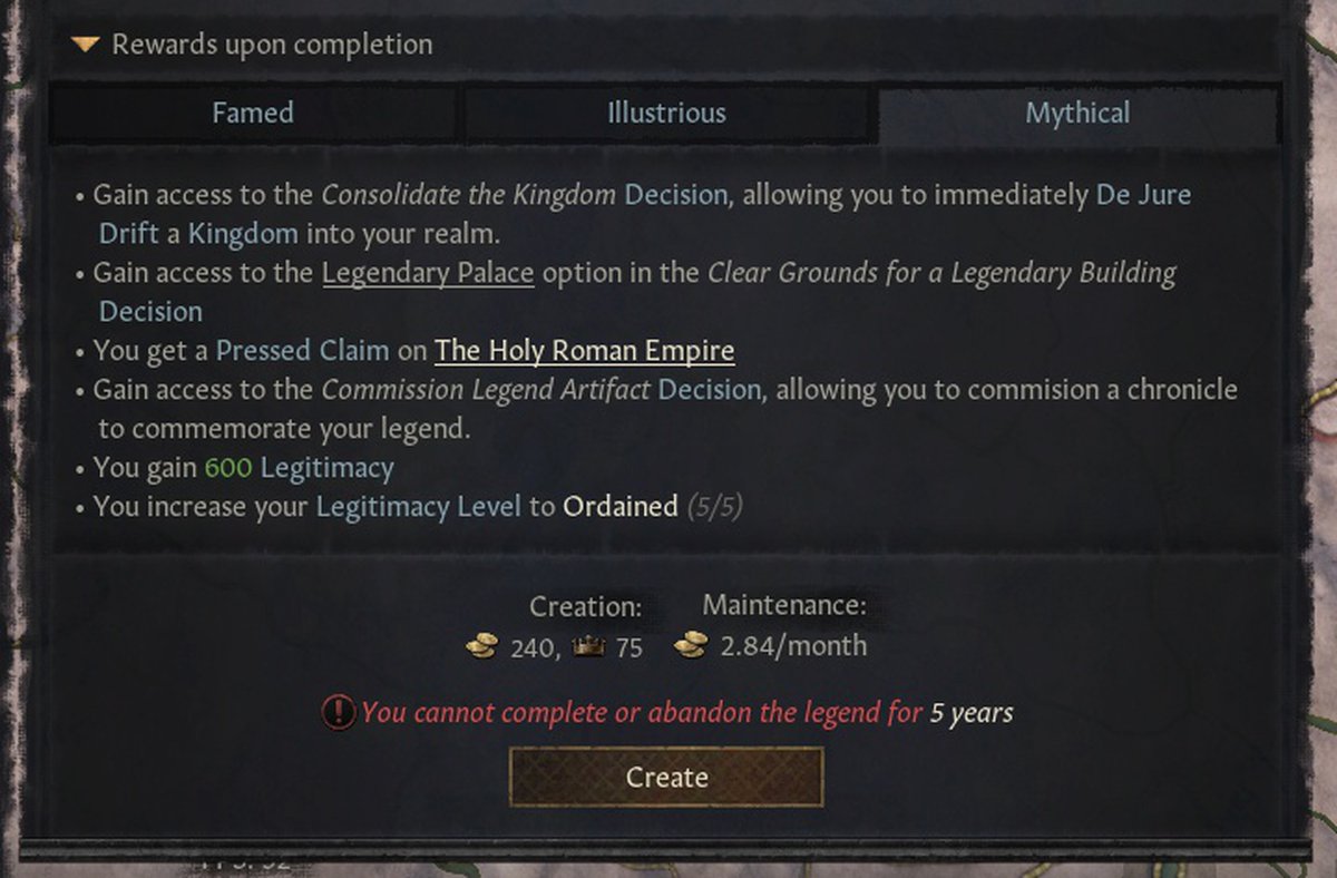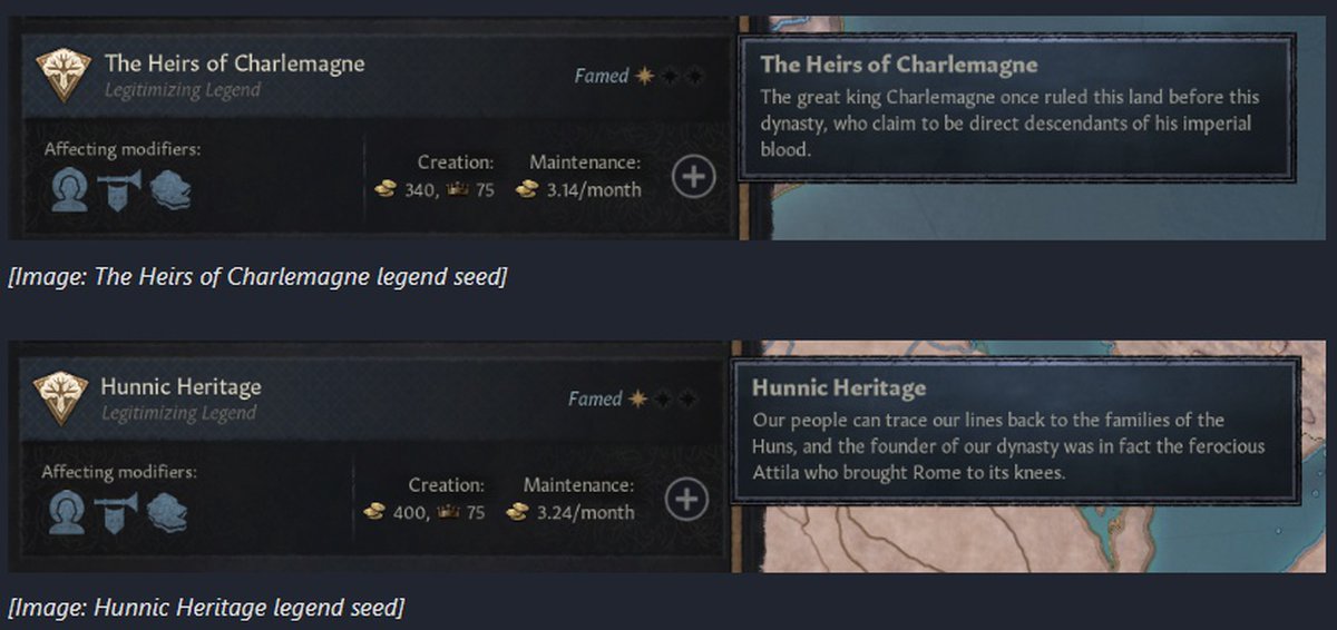 А ещё будут легенды легитимизирующие. Они будут давать легитимность и претензии на земли. Условно работает как-то так, персонаж выдаёт себя потомком Карла Великого или короля Артура, а значит, имеет право на соответствующие территории.