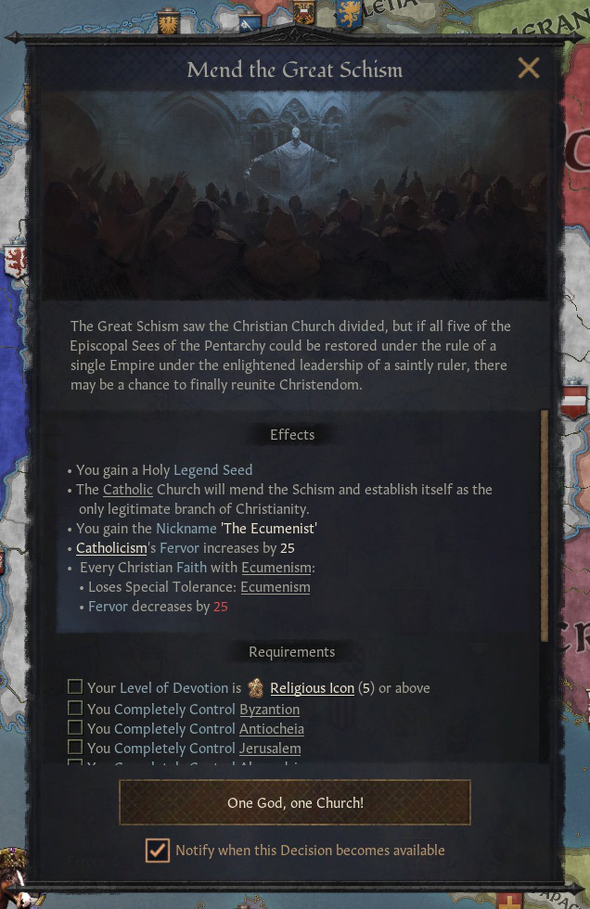 Например, если контролировать Константинополь, Иерусалим, Антиохию и ещё что-то, а также быть при этом живой иконой, то можно стать легендарным объединителем христианства. Впрочем, даже если просто попросить летописца что-то накалякать, может легенда получиться.